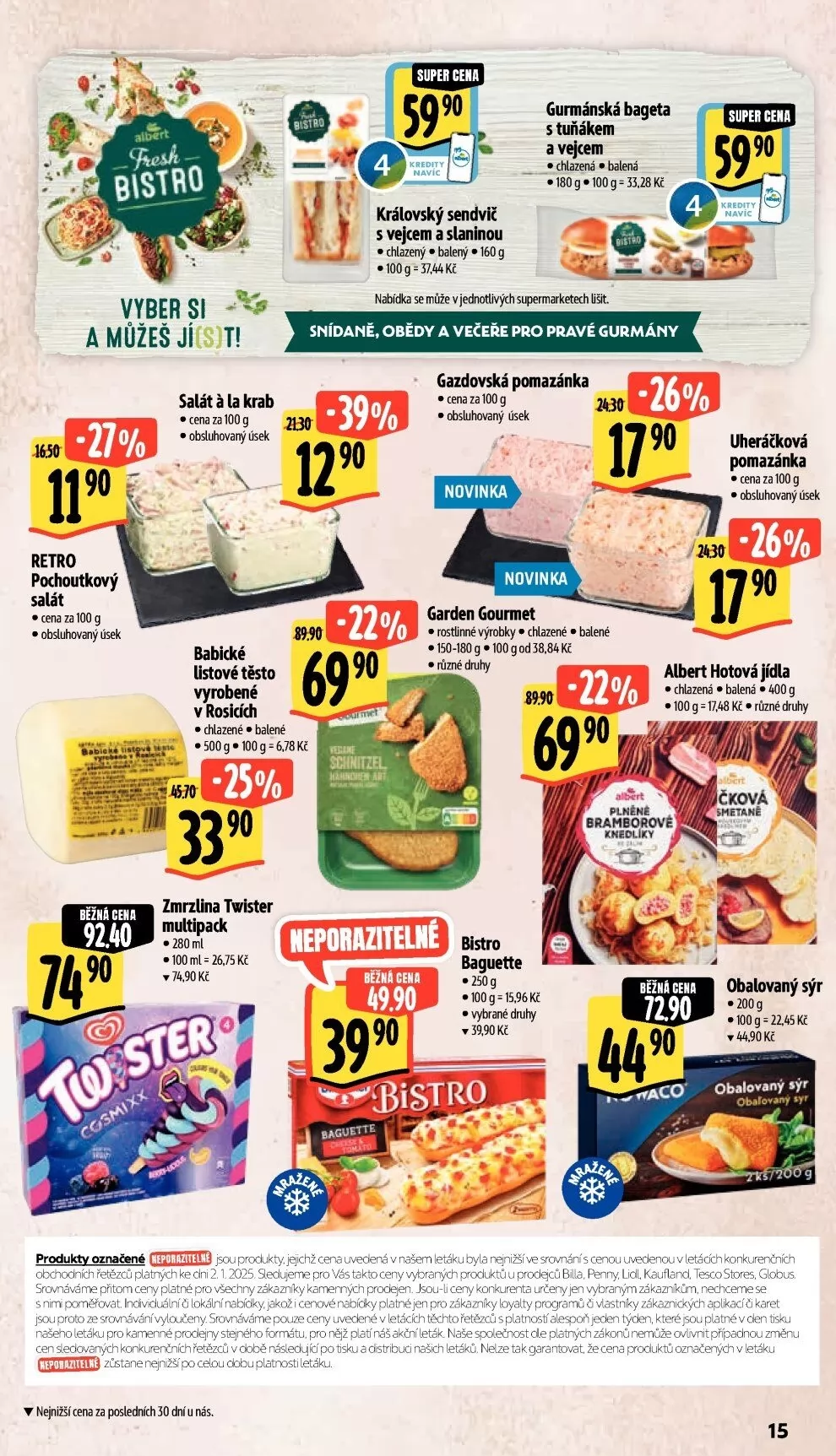 V letáku obchodu Albert najdete širokou nabídku chutných produktů, které potěší každého gurmána. Mezi novinkami se objevuje retro pochoutkový salát a gazdovská pomazánka, které jsou k dostání v obsluhovaném úseku. Pro milovníky rychlého občerstvení je tu královský sendvič s vejcem a slaninou nebo gurmánská bageta s tuňákem a vejcem, obě chlazené a balené.