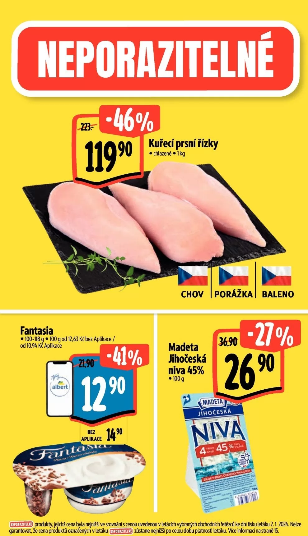 V letáku obchodu Albert najdete širokou nabídku kvalitních produktů. Mezi nimi se vyjímají neporazitelné kuřecí prsní řízky za skvělou cenu 119,90 Kč za 1 kg. Dále si můžete vybrat z lahodného sýru Madeta Jihočeská Niva 45% za 21,90 Kč za 100 g. Nezapomeňte také na produkty Fantasia, které jsou k dispozici v balení 100-118 g, s cenou od 12,63 Kč bez aplikace a od 10,94 Kč s aplikací. Všechny ceny jsou platné ke dni tisku letáku 2.1.2024, avšak nelze garantovat, že zůstanou nejnižší po celou dobu platnosti letáku. Pro více informací se podívejte na stranu 15.