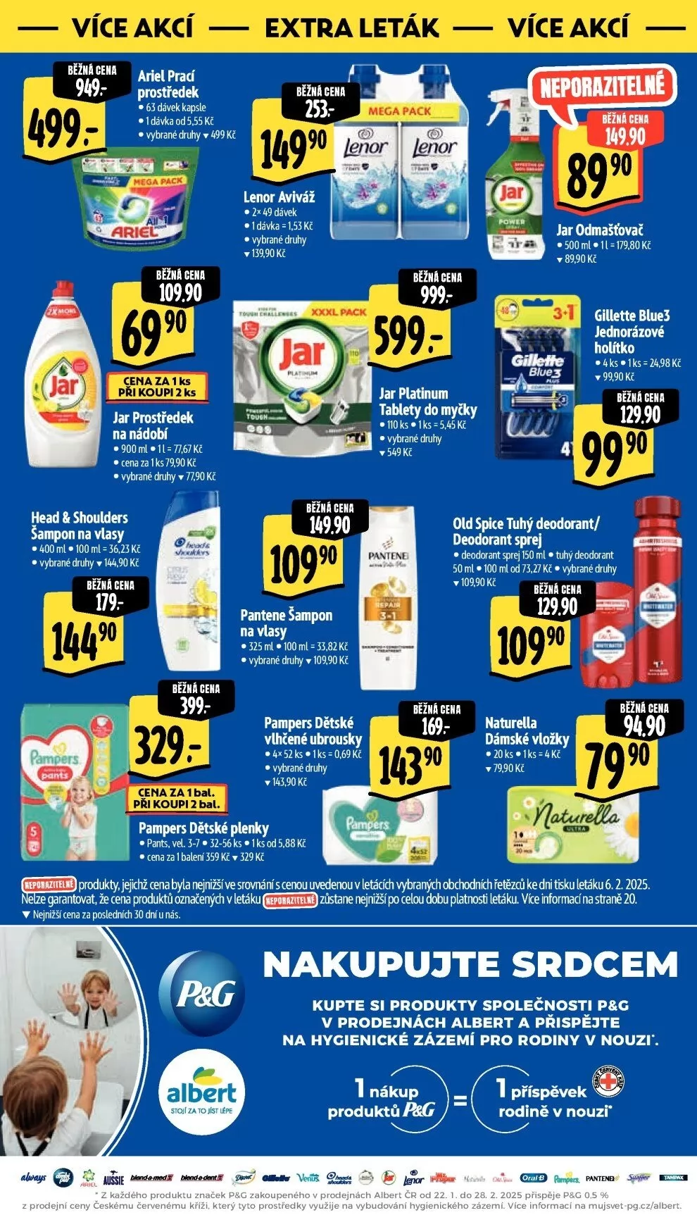 V letáku obchodu Albert najdete širokou nabídku produktů za akční ceny. Mezi nimi se objevují prací prostředky Ariel s mega balením 63 dávek za 499 Kč, Jar prostředek na nádobí za 77,90 Kč, a šampony Head & Shoulders od 144,90 Kč.