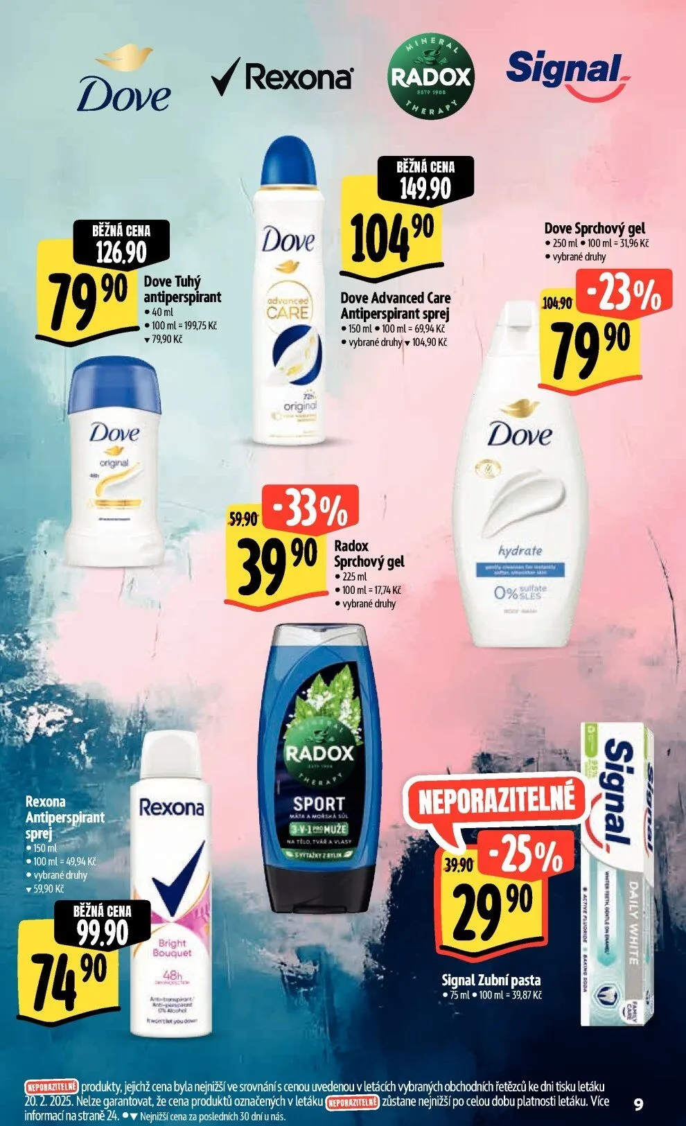Dále si můžete vybrat z nabídky sprchových gelů, jako je Radox sprchový gel 225 ml za 149,90 Kč a Dove sprchový gel 250 ml za 99,90 Kč. Nezapomeňte také na Signal zubní pastu, která je k dostání za 32,87 Kč za 75 ml.