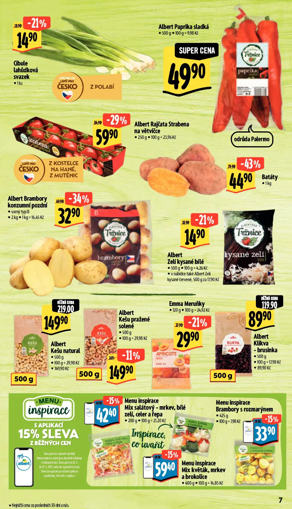 V letáku obchodu Albert najdete širokou nabídku čerstvých a kvalitních produktů. Mezi nimi se objevuje cibule z Polabí, lahůdková v svazku, a konzumní brambory pozdní v balení po 2 kg za 16,45 Kč/kg. Dále si můžete vybrat kešu ořechy natural nebo pražené solené, obě varianty v balení po 500 g za 149,90 Kč.
