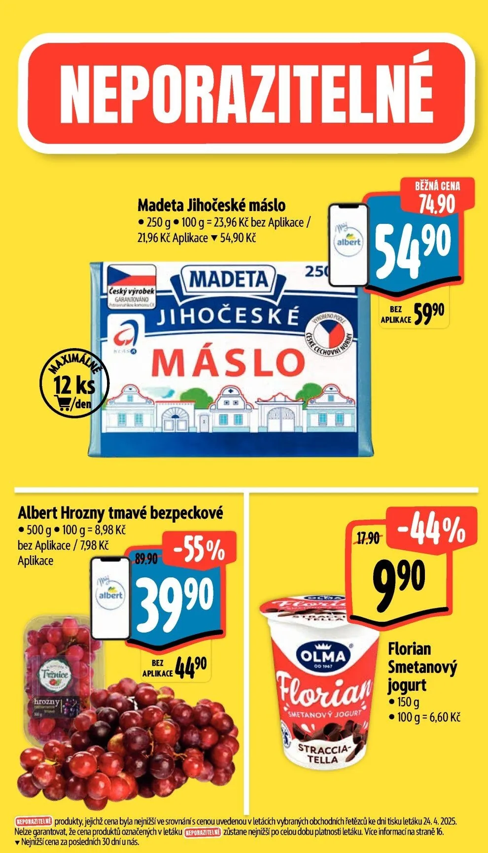 V letáku obchodu Albert najdete skvělé nabídky na vybrané produkty. Mezi nimi se nachází Madeta Jihočeské máslo o hmotnosti 250 g, které je k dispozici za cenu 54,90 Kč, přičemž s aplikací můžete ušetřit a koupit ho za 21,96 Kč za 100 g. Dále si můžete pořídit tmavé hrozny bez pecek o hmotnosti 500 g za 89,90 Kč, nebo s aplikací za 7,98 Kč za 100 g. Nezapomeňte také na Olma Stracciatellu, která je nabízena za 59,90 Kč. A pro milovníky jogurtů je tu Florian smetanový jogurt o hmotnosti 150 g. Využijte těchto skvělých nabídek a ušetřete!