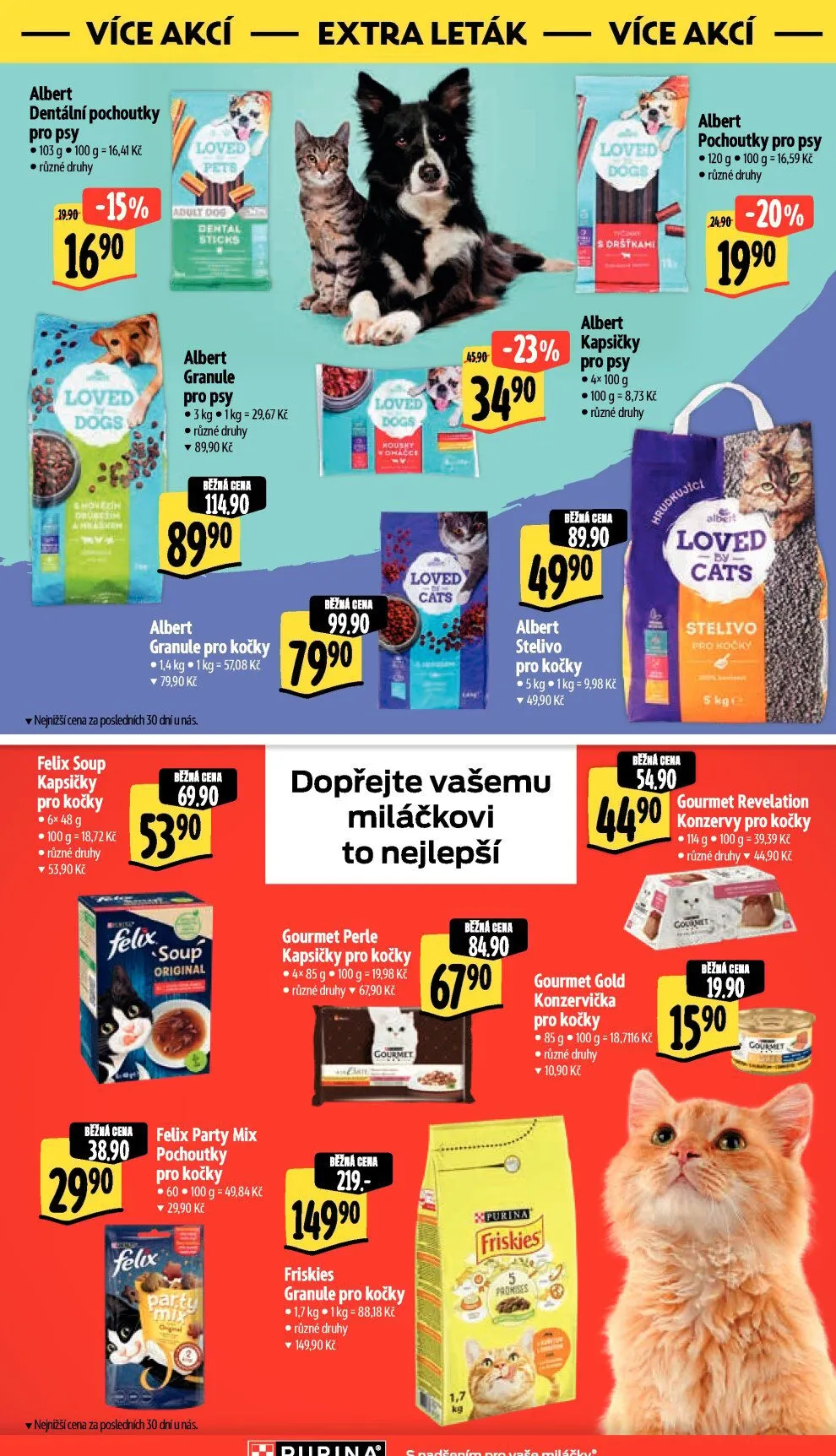 V letáku obchodu Albert najdete širokou nabídku produktů pro vaše domácí mazlíčky. Nabízíme dentální pochoutky pro psy různých druhů za skvělou cenu 4,90 Kč. Granule pro psy jsou k dispozici od 89,90 Kč a kapsičky pro psy za 34,90 Kč.