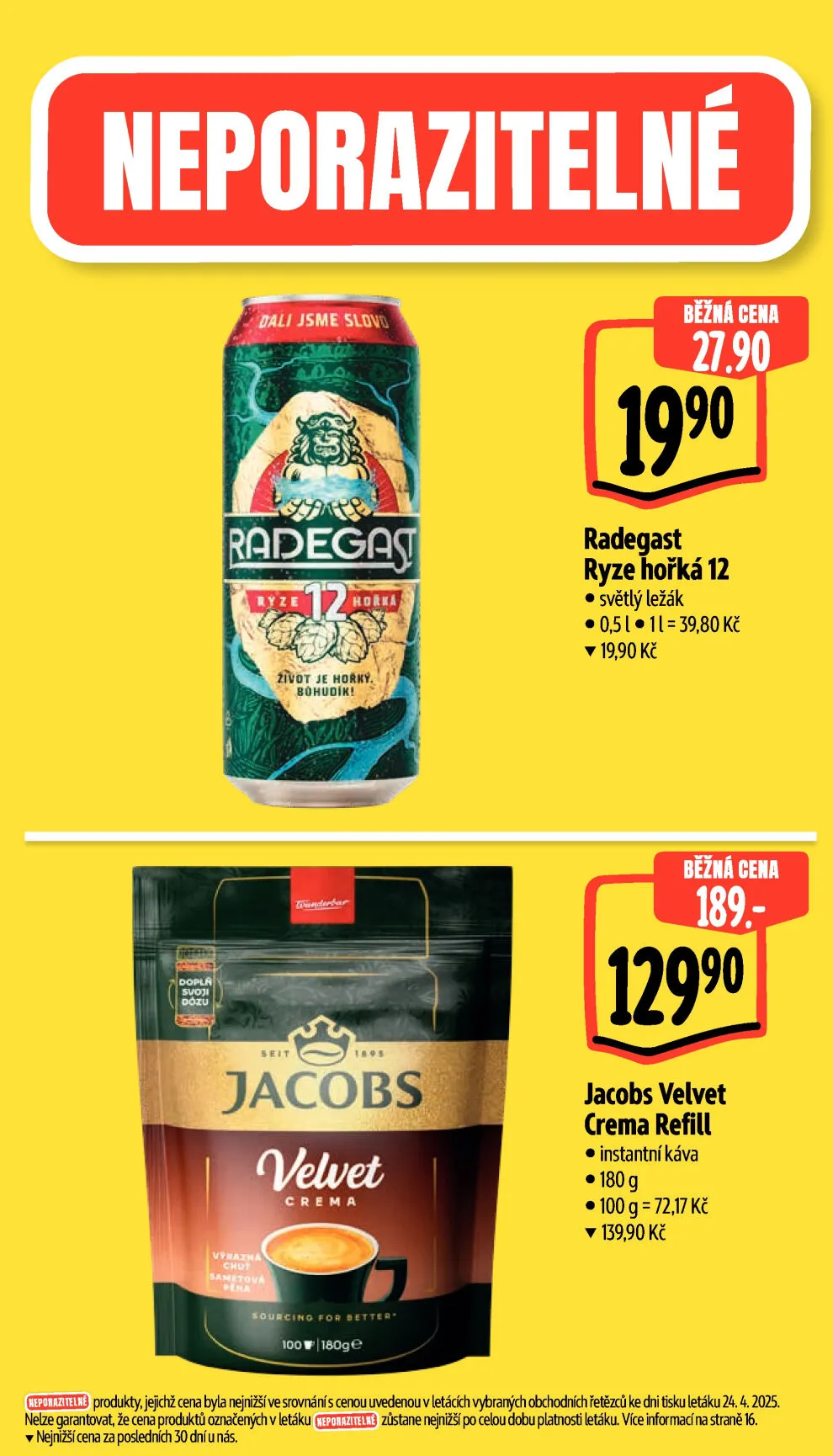 V letáku obchodu Albert najdete širokou nabídku produktů za skvělé ceny. Mezi nimi se objevuje instantní káva Jacobs Velvet o hmotnosti 180 g za 139,90 Kč. Dále si můžete vychutnat světlý ležák Radegast s hořkou chutí za 19,90 Kč. Nezapomeňte, že ceny uvedené v letáku jsou nejnižší v porovnání s jinými obchodními řetězci k datu tisku letáku. Pro více informací se podívejte na stranu 16.