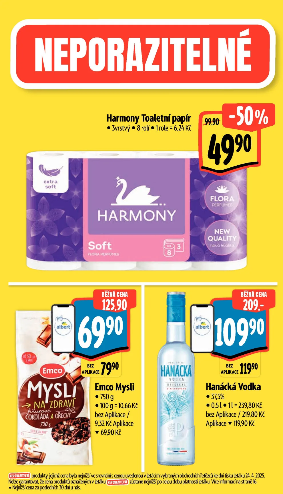 V letáku obchodu Albert najdete širokou nabídku produktů za výhodné ceny. Například toaletní papír Harmony je 3vrstvý a obsahuje 8 rolí, přičemž cena jedné role je 6,24 Kč. Dále si můžete pořídit parfém Flora za 209 Kč, který nabízí jemnou vůni. Pro milovníky zdravého životního stylu je tu Emco Mysli v balení 750 g za 10,66 Kč. Nezapomeňte také na Hanáckou vodku s obsahem alkoholu 37,5 %, kterou můžete mít za 119,90 Kč při využití aplikace. Všechny ceny jsou aktuální k datu tisku letáku a mohou se měnit.