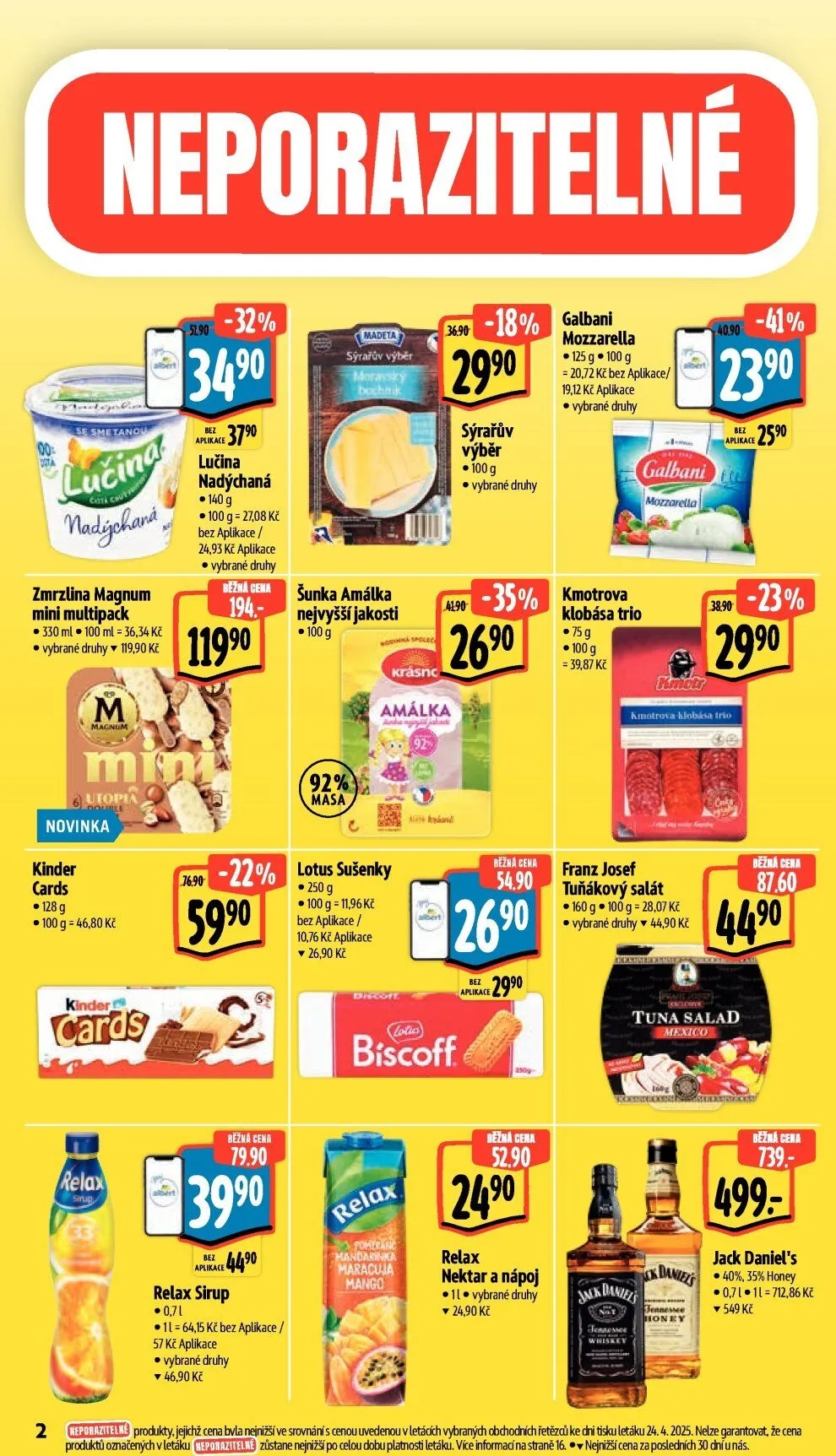 V letáku obchodu Albert najdete širokou nabídku produktů za skvělé ceny. Například zmrzlina Magnum mini multipack (100 ml) je nyní za 119,90 Kč, což představuje slevu 41%. Novinkou jsou Kinder Cards (128 g) a také Lučina nadýchaná (140 g) za 249,90 Kč.