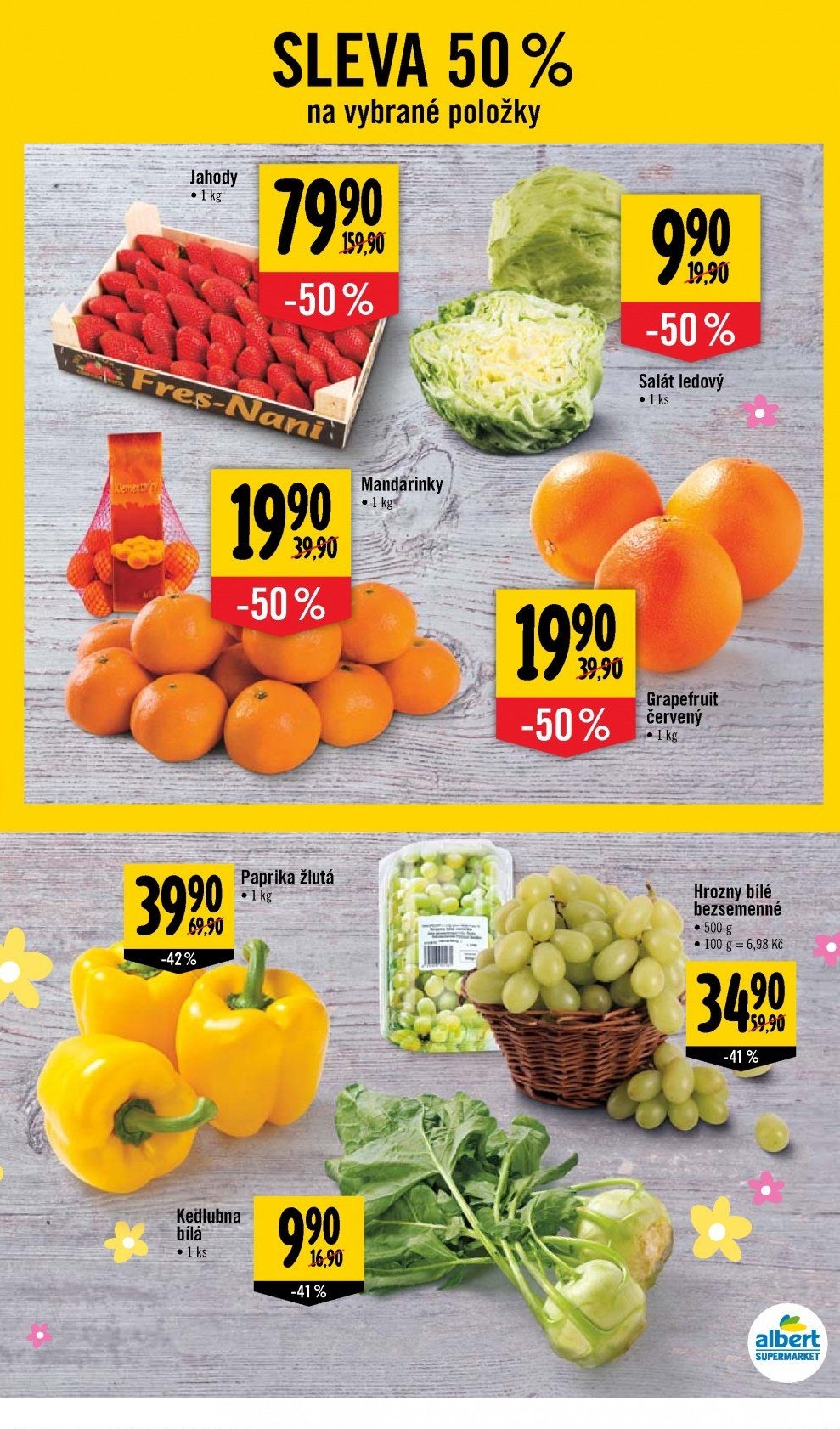 jahody sleva 500/0 na vybrané položky 7992 mandárinky taprika žlutá kg -kedlubna bílá salát ledový 39,90 grapefruit červený hrozny bílé bezsemenné 500 g • 100 6,98 kč -41 0/0 albert supermarket