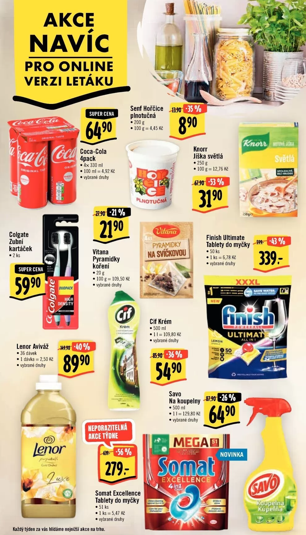 akce navíc pro online verzi letáku super cena 6490 coca-cola 4pack • 4x 330 ml • 100 ml -4,92 kč • vybrané druhy senf hořčice plnotučná 100 g = 4,45 kč 890 knorr jíška světlá • 250 g • 12,76 kč -530/0 světlá 3397 colgate zubní kartáček super cena lenor aviváž *9t • 36 dávek i dávka 2,50 kč • vybrané druhy lenor vitana pyramidky koření 20 g • 100 g = 109,50 kč • vybrané druhy krém neporazitelná týdne 2797 somat excellence tablety do myčky • vybrané druhy pyramidky na cif krém • 500 ml • il 109,80 kč • vybrané druhy savo finish ultimate tablety do myčky • 50 ks • vybrané druhy hiiish ultima na koupelny • 500 ml 11-129,80 • vybrané druhy megan novinka excellence 't) petnal každý týden za vás hlídáme nejnižší akce na trhu.