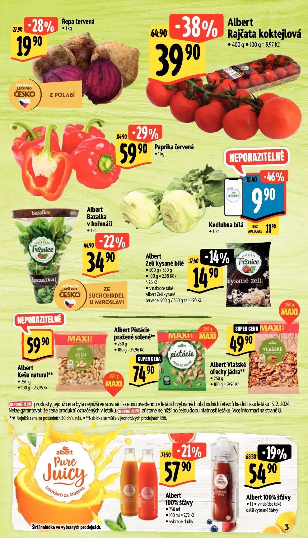 prochlkty, jejkhž cena byla nejnižšíve srovnání s cenou uvedenou v letácích vybraných obchodních řetea ke dni fisku letáku 15.2 2024.