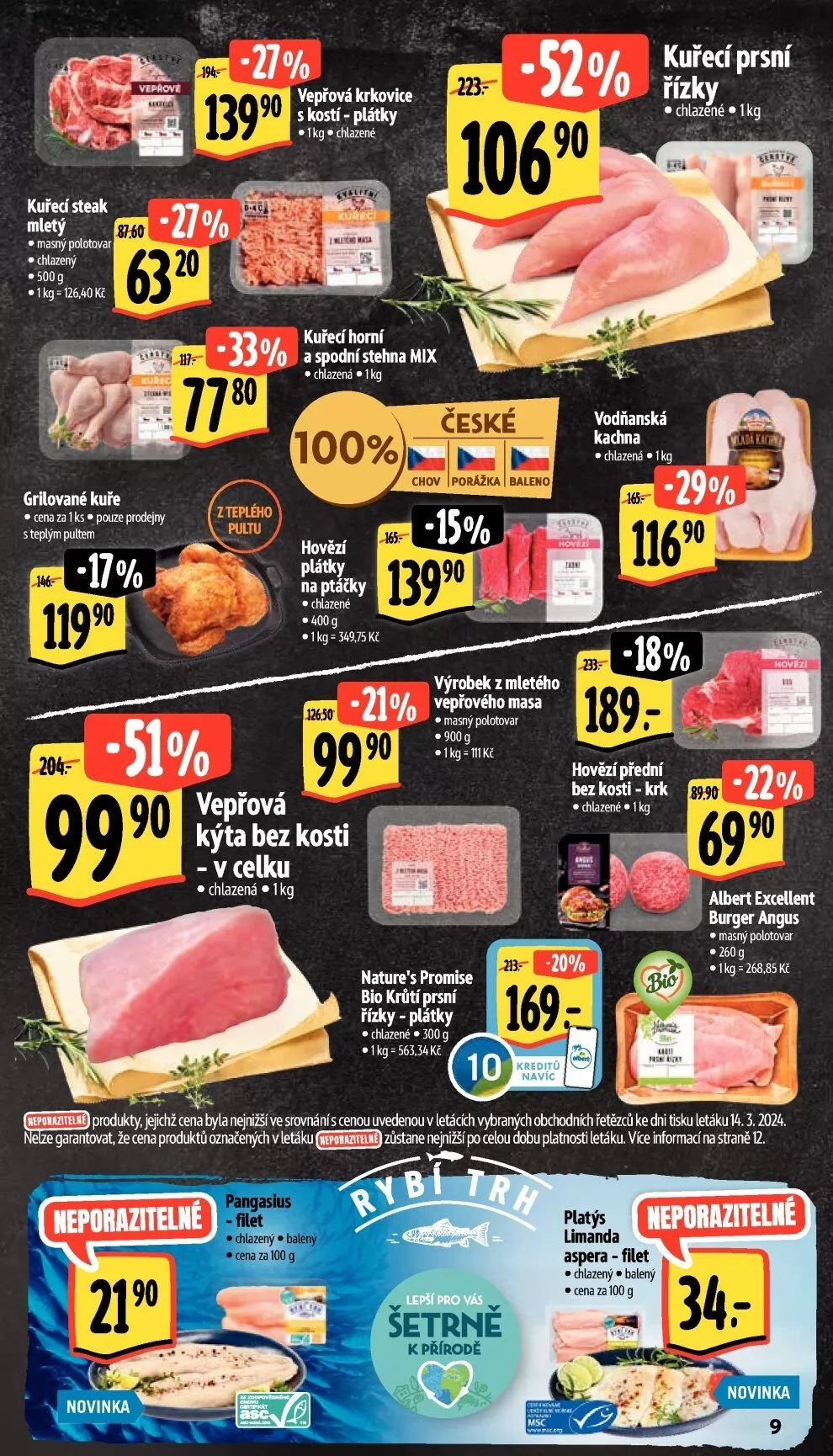 produkty, cena byla nejnižší ve srovnání s cenou uvedenou v letácích vybraných obchodních řetězců ke dni tisku letáku 14.3.2024.
