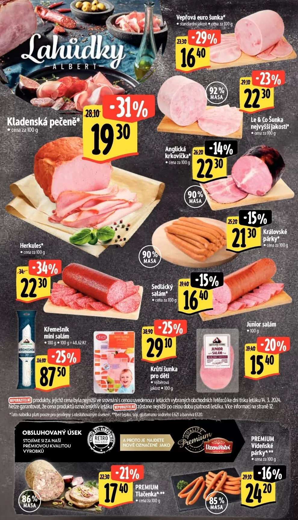 produkty, áchžcena bylanejhižšíve srovnání s cenouuvedenouv letácích vybraných obchodních řetězců ke dni ťsku letáku 14.3.2024.