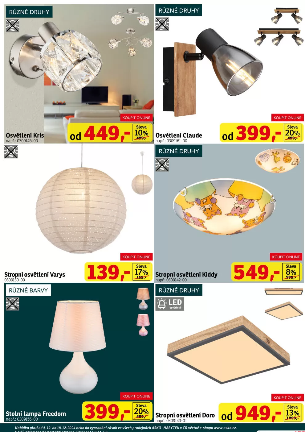 V letáku obchodu ASKO najdete širokou nabídku různých druhů osvětlení. Mezi nimi se nachází stropní osvětlení Varys, které je k dispozici v různých barvách (kód: 0309130-00). Dále nabízíme stylovou stolní lampu Freedom (kód: 0309155-00) za cenu od 449 Kč.