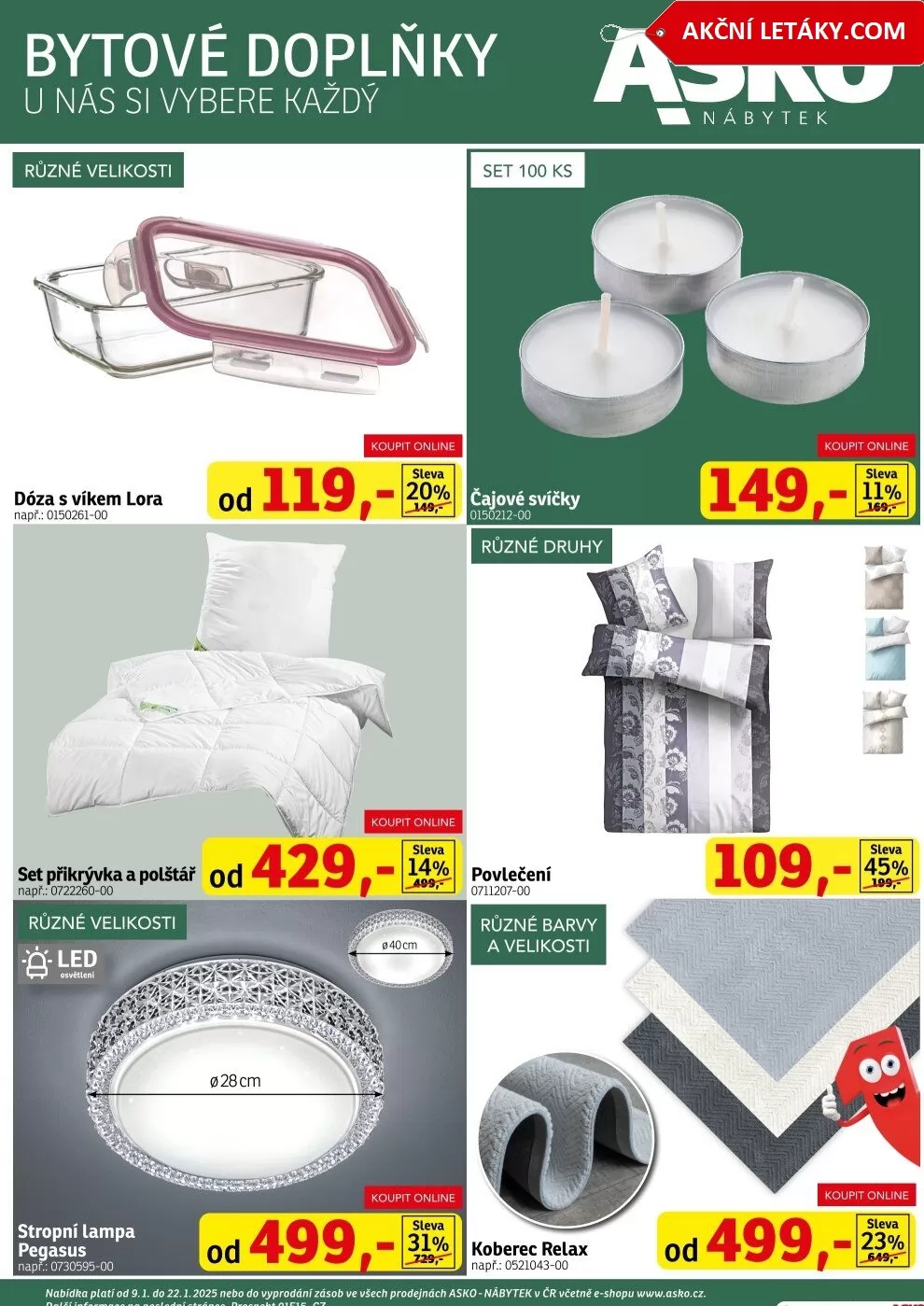 V letáku obchodu ASKO najdete širokou nabídku bytových doplňků, které potěší každého. Nabízíme různé velikosti a styly, jako například dózu s víkem Lora za cenu od 429,- Kč. Dále si můžete pořídit set přikrývky a polštáře od 499,- Kč.