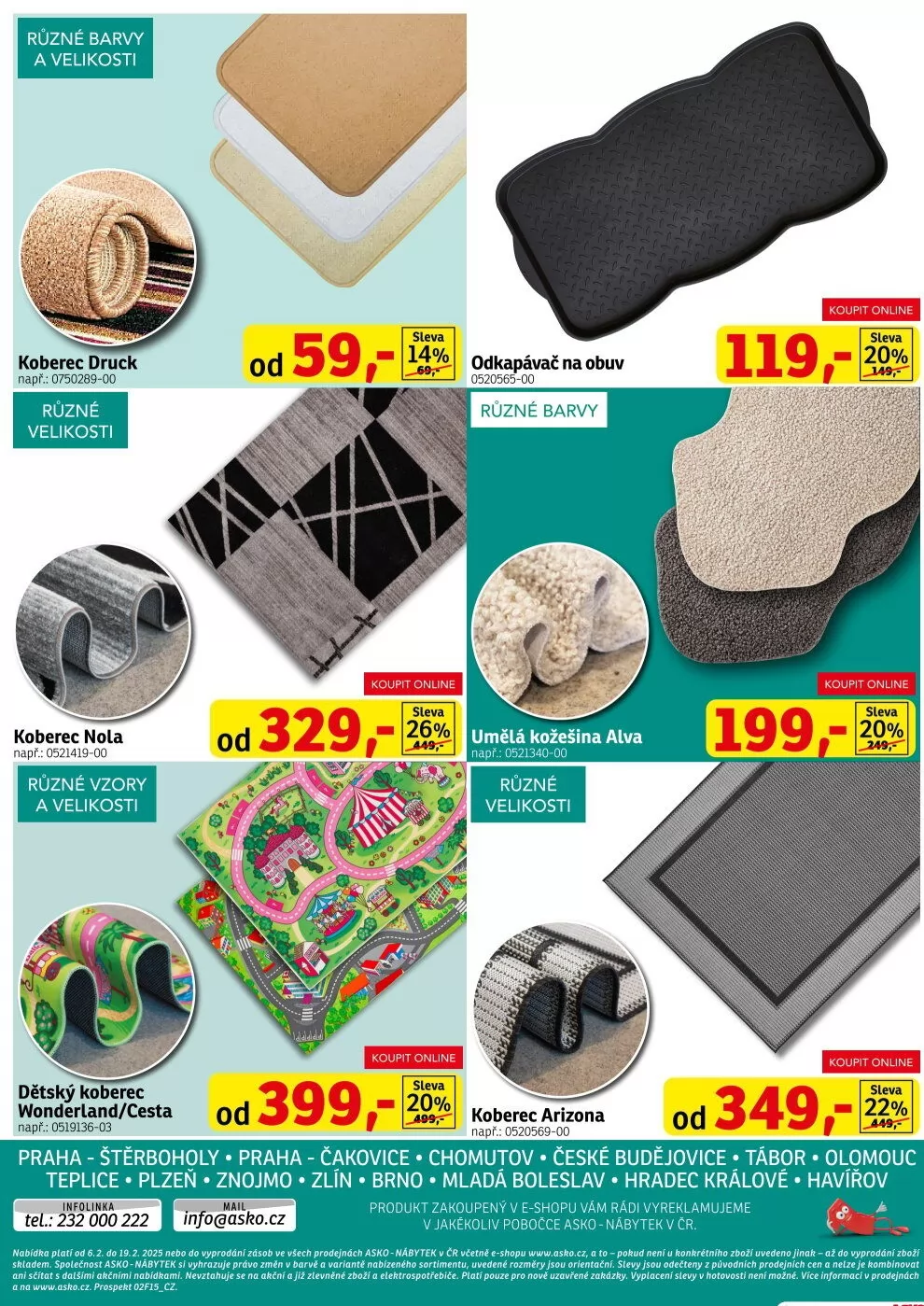 V letáku obchodu ASKO najdete širokou nabídku koberců v různých barvách a velikostech. Mezi nimi je například koberec Druck (č. 0750289-00) a koberec Nola (č. 0521419-00). Pro děti je k dispozici dětský koberec Wonderland/Cesta (č. 0519136-03).