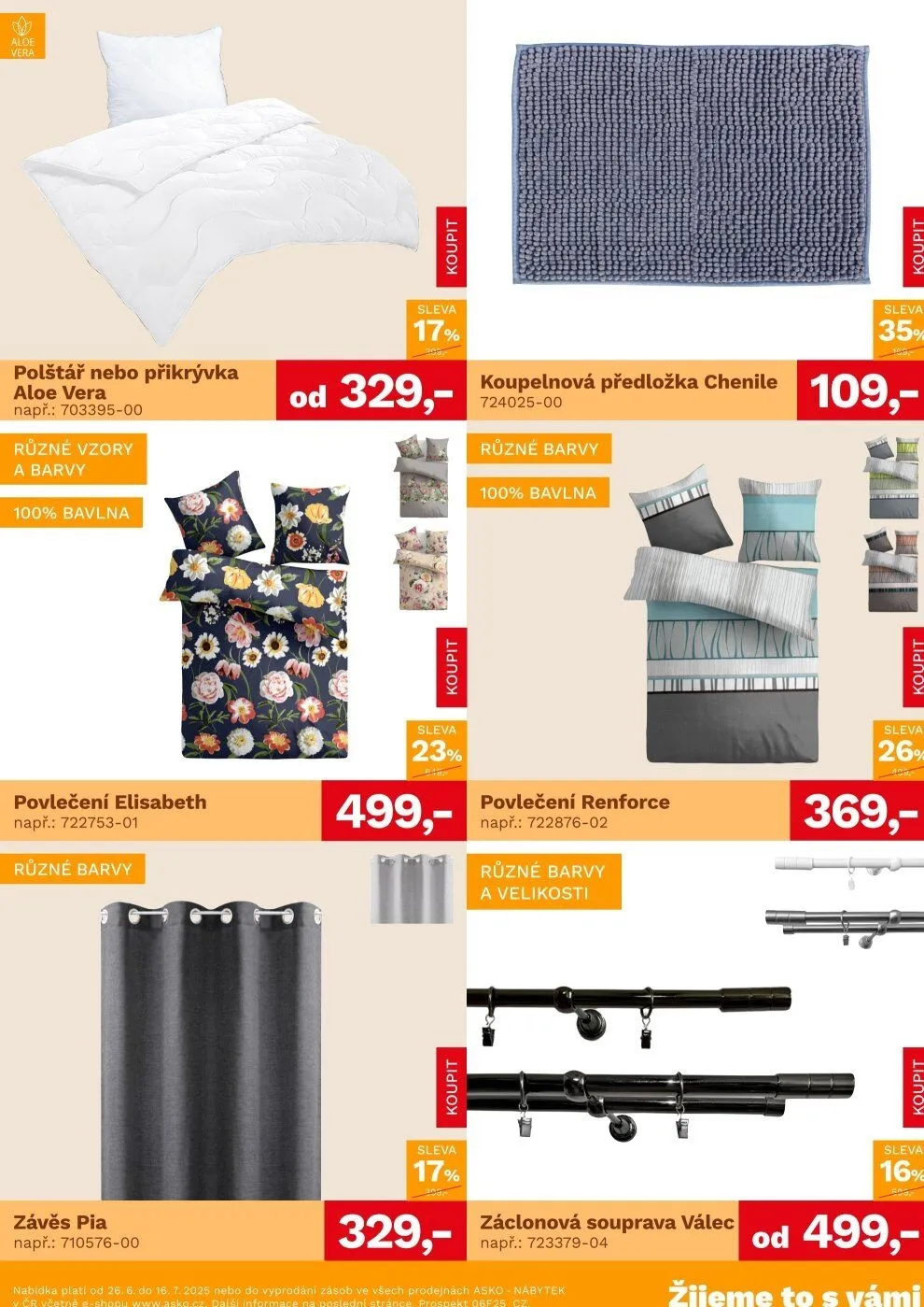 Dalšími lákadly jsou povlečení Renforce a záclonová souprava Válec, které jsou rovněž ve slevě. Tato nabídka platí od 26. 6. 2025 nebo do vyprodání zásob ve prodejnách ASKO.