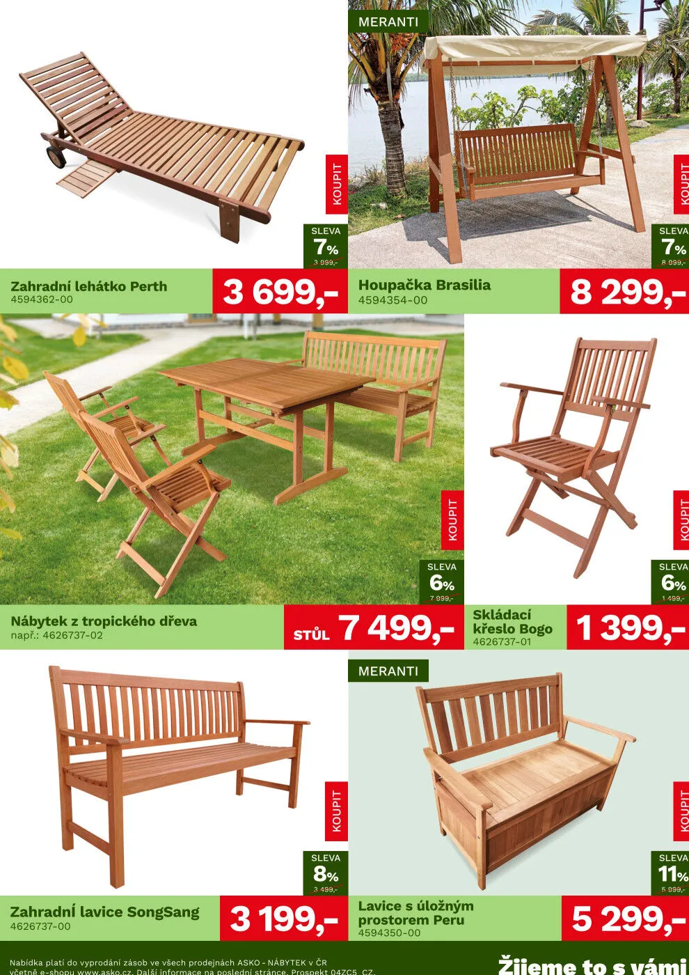 V letáku obchodu ASKO najdete širokou nabídku zahradního nábytku za skvělé ceny. Mezi produkty se nachází zahradní lehátko Perth, které je vyrobeno z kvalitního tropického dřeva. Dále nabízíme zahradní lavici Songsang z meranti, nyní se slevou. Pro relaxaci doporučujeme houpačku Brasilia, která je skládací a ideální pro letní dny. Křeslo Bogo z meranti je také v akci, stejně jako lavice s úložným prostorem Peru. Nezapomeňte, že nabídka platí do vyprodání zásob ve všech prodejnách ASKO - nábytek v ČR.