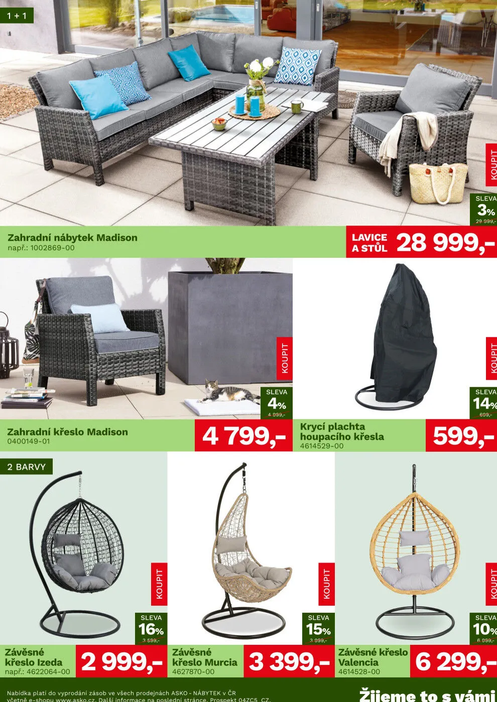 V letáku obchodu ASKO najdete širokou nabídku zahradního nábytku. Mezi nejzajímavější produkty patří zahradní křeslo Madison, které je k dispozici ve dvou barvách za cenu 2 999,- Kč. Dále nabízíme lavici a stůl za skvělou cenu 999,- Kč. Pro ochranu vašeho nábytku doporučujeme krycí plachtu za 4 799,- Kč.