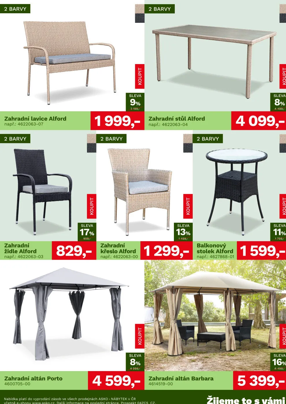 V letáku obchodu ASKO najdete širokou nabídku zahradního nábytku. Mezi produkty se nachází zahradní lavice Alford, která je dostupná ve dvou barvách a nyní se slevou 9%. Dále nabízíme zahradní židle Alford za cenu 829 Kč, původně 1999 Kč. Zahradní křeslo Alford je také k dispozici ve dvou barvách. Nezapomeňte na zahradní stůl Alford, který nyní pořídíte za 439 Kč místo původních 1299 Kč. Pro menší prostory je ideální balkonový stolek Alford za 1 799 Kč.