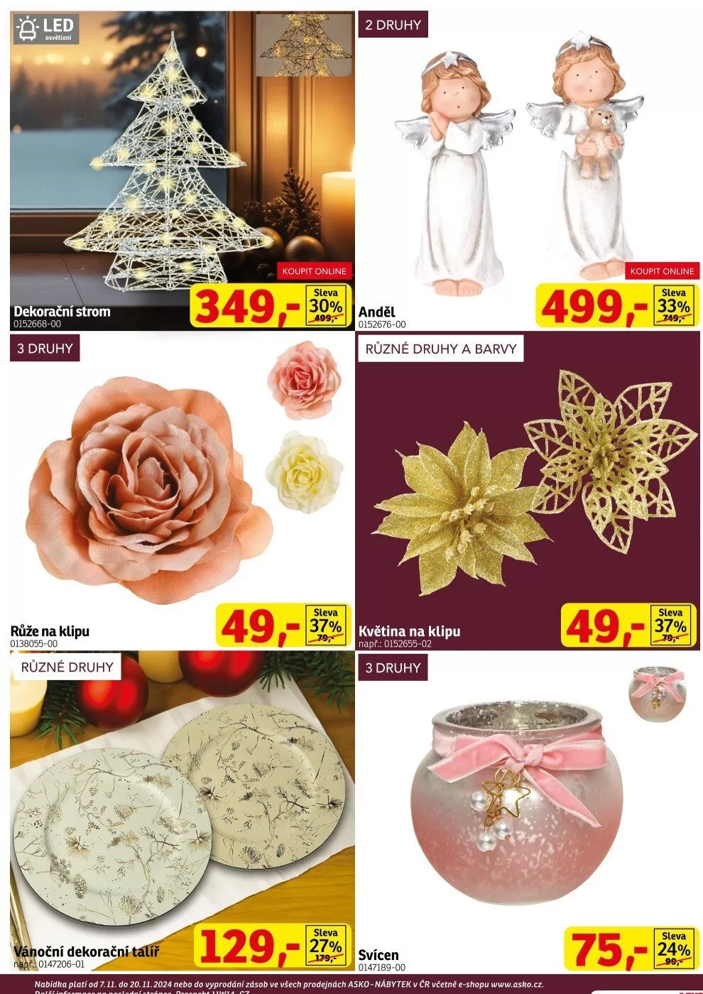 V letáku obchodu ASKO najdete širokou nabídku dekorativních produktů, které oživí váš domov. Mezi nimi je dekorační strom (kód 0152568-00) ve třech různých druzích, růže na klipu (kód 0138055-00) v různých variantách a oční dekorace (kód 0147206-01) s atraktivní slevou. Dále nabízíme anděly (kód oe52676-oo) v různých druzích a barvách, květiny na klipu (např. 0152655-02) ve třech variantách a elegantní svícen (kód 0147189-00) za cenu 499,- Kč. Nezapomeňte, že nabídka platí do 20. 2024 nebo do vyprodání zásob ve všech prodejnách ASKO a na e-shopu www.asko.cz.