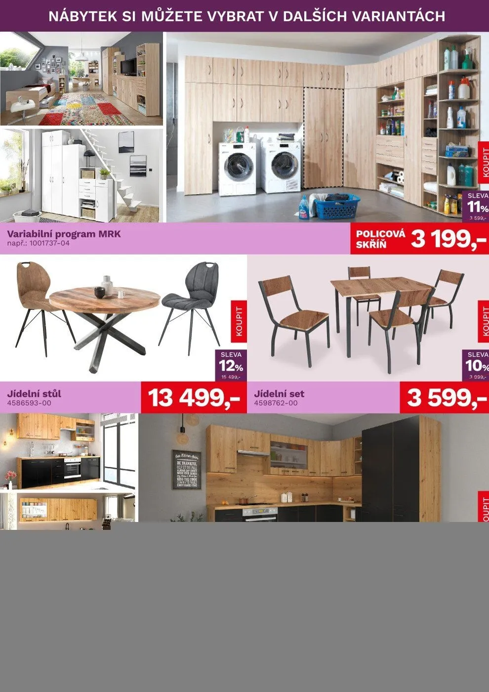 V letáku obchodu ASKO najdete širokou nabídku nábytku v různých variantách. Mezi hlavní produkty patří jídelní stůl (kód: 1001737-04) a kuchyně Modena (kód: 4586593-00) se slevou 13 499 Kč. Dále nabízíme jídelní set (kód: 4615480-20) a policovou skříň (kód: 4598762-00) za zvýhodněné ceny. Dřezová skříňka je k dispozici za 3 599 Kč a další produkty se slevou 1 999 Kč.