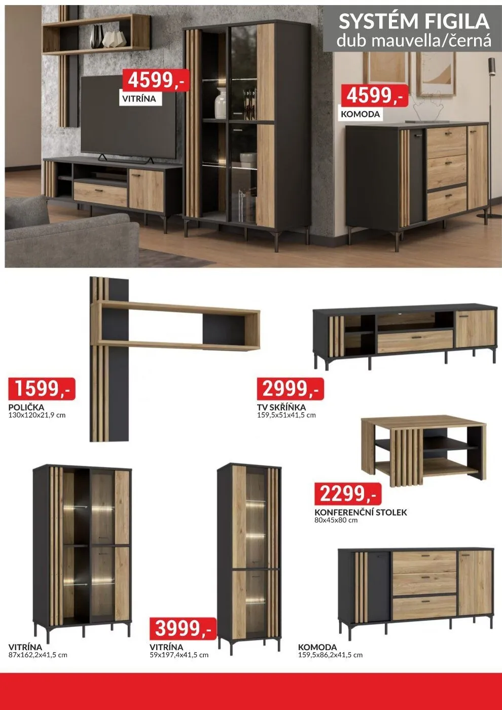 Všechny produkty jsou vyrobeny v moderním designu, včetně systému figila v dekoru dub mauvella/černá.