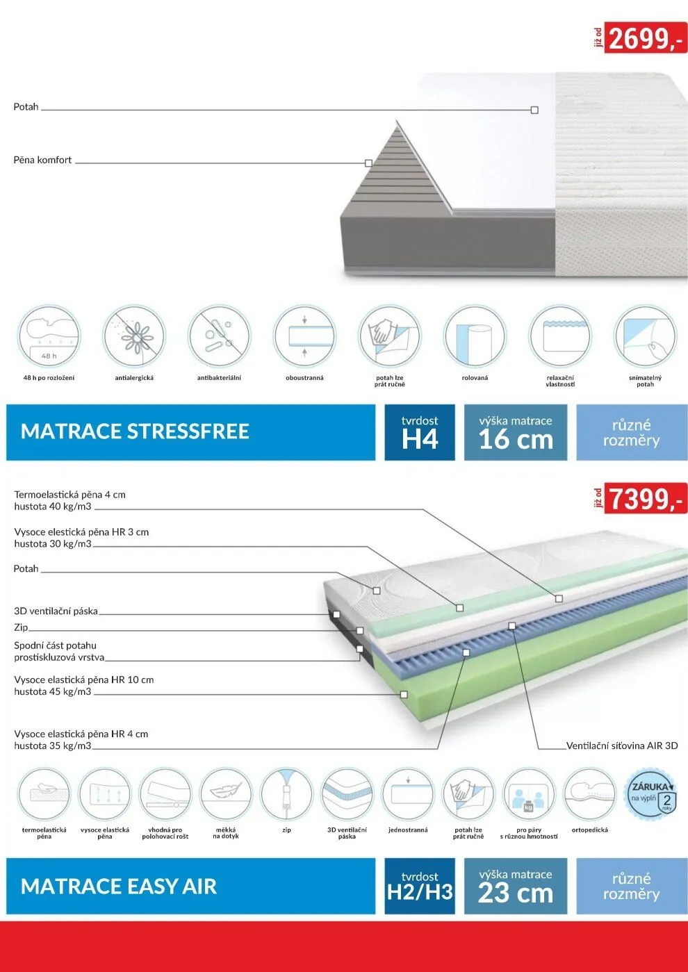 V letáku obchodu bauMax najdete širokou nabídku kvalitních matrací a potahů. Nabízíme matraci Stressfree s termoelastickou pěnou o tloušťce 4 cm a hustotou 40 kg/m3, která zaručuje komfortní spánek. Dále máme vysoce elastickou pěnu s různými tloušťkami a hustotami, která se přizpůsobí vašim potřebám.