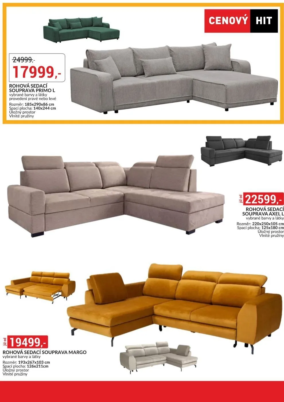 Rohová sedací souprava Primo L je k dispozici v různých barvách a látkách, s rozměry 185x290x86 cm a spací plochou 140x244 cm. Souprava nabízí také úložný prostor a vlnité pružiny za cenu 19 499 Kč.