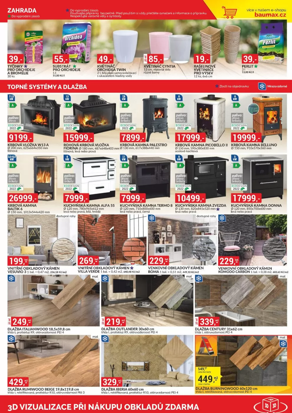 V letáku obchodu bauMax najdete širokou nabídku produktů pro vaši zahradu a domácnost. Mezi zajímavé položky patří tyčinky pro orchideje a bromélie za 39 Kč, substrát pro orchideje za 55 Kč a perlit za 39 Kč.