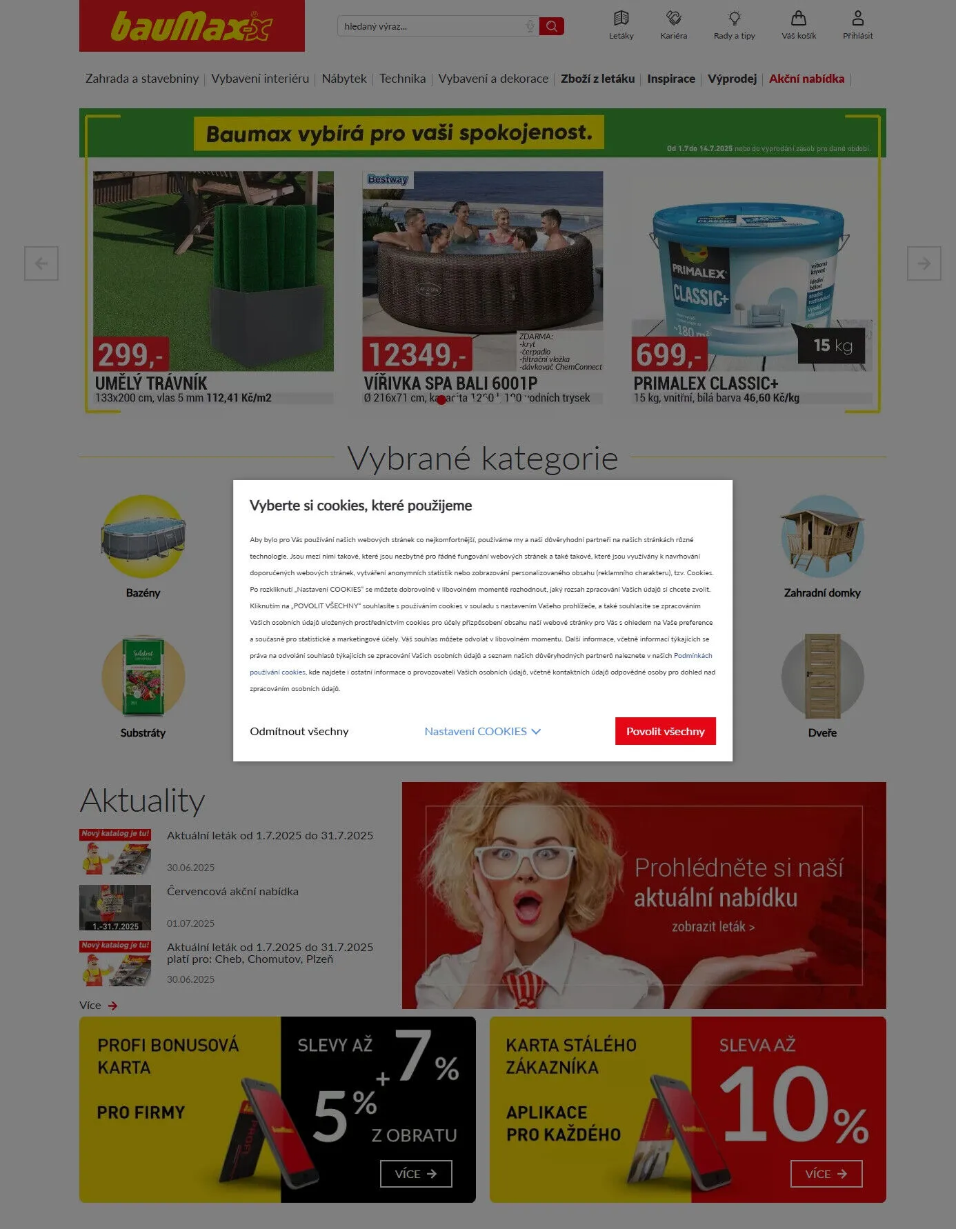 Mezi akčními nabídkami se objevuje umělý trávník o rozměrech 133x200 cm za 299,- Kč a kvalitní barva Primalex Classic+ 15 kg za 699,- Kč.