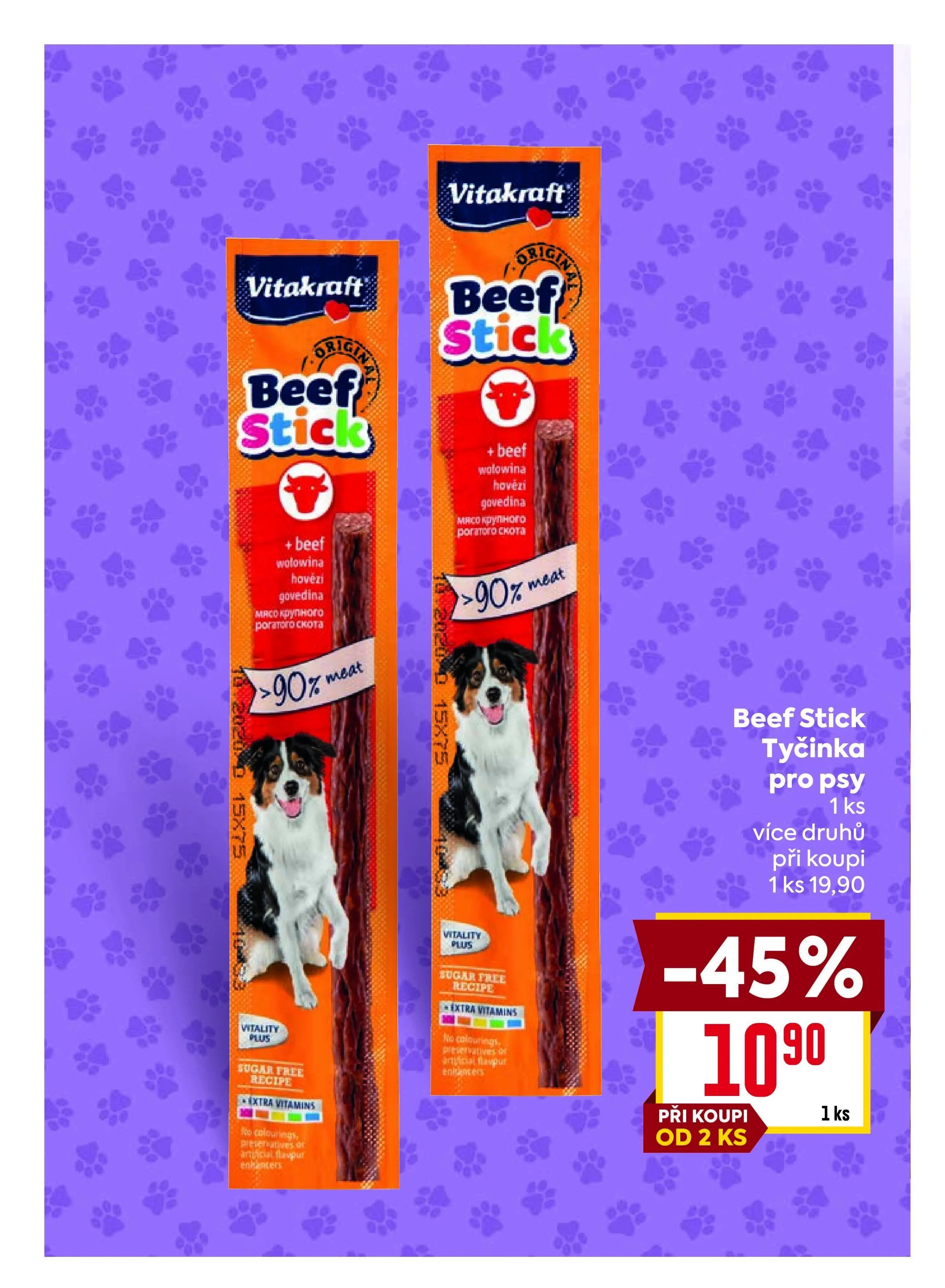 V letáku obchodu BILLA najdete širokou nabídku produktů značky Vitakraft. Mezi nimi se objevují chutné hovězí tyčinky pro psy, které jsou k dispozici ve více druzích. Při koupi jedné tyčinky zaplatíte 19,90 Kč, ale pokud si zakoupíte dvě a více, můžete využít výhodnější cenu. Nezapomeňte potěšit svého čtyřnohého kamaráda kvalitními pamlsky!