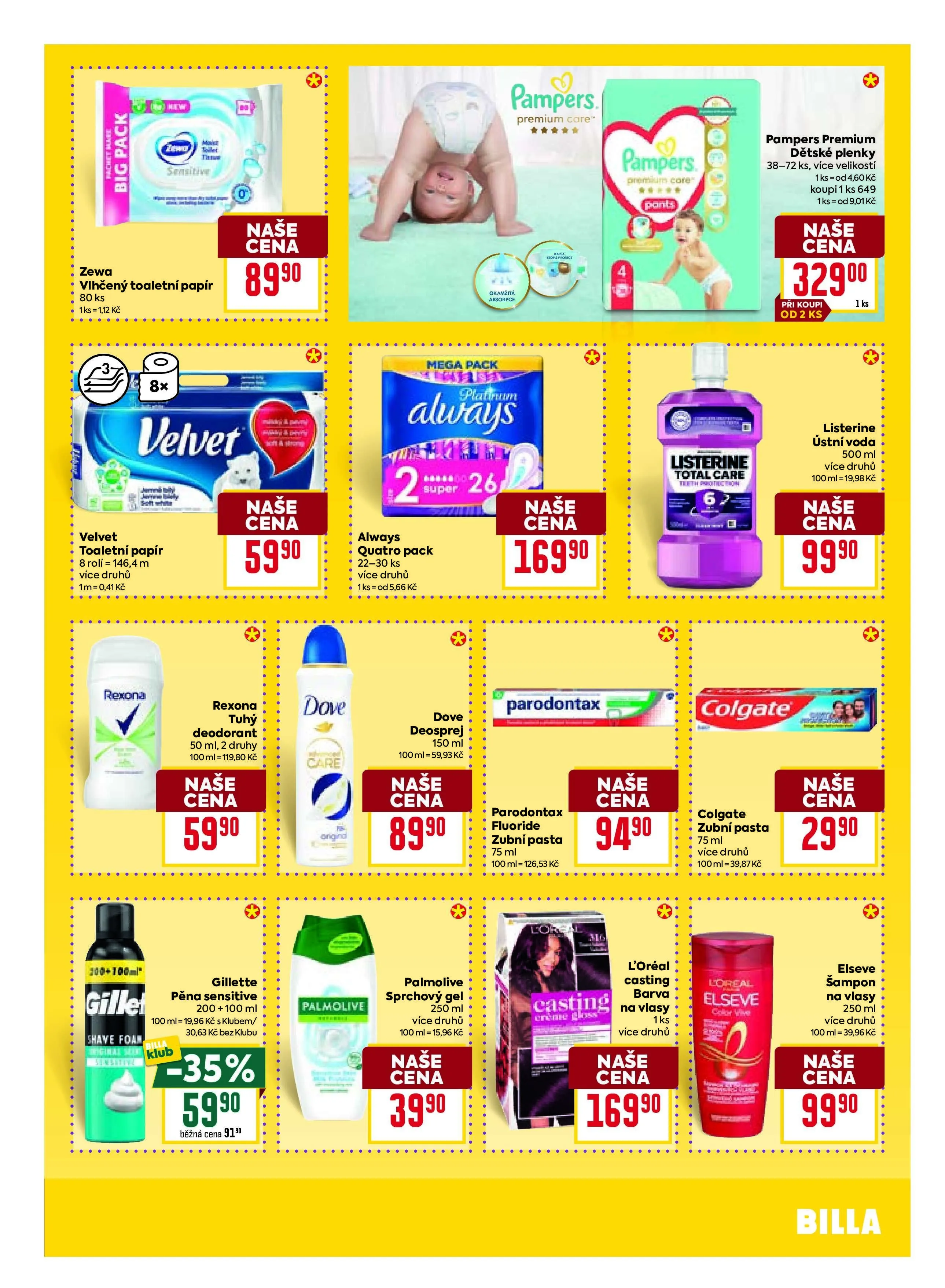 V letáku obchodu BILLA najdete širokou nabídku produktů za skvělé ceny. Mezi nimi jsou například dětské pleny Pampers za 32,90 Kč, ústní voda Listerine (500 ml) za 59,90 Kč a tuhé mýdlo Palmolive za 39,90 Kč. Nezapomeňte také na šampon Colgate za 29,90 Kč a zubní pastu Parodontax za 94,90 Kč. Využijte akční nabídky a nakupujte výhodně!