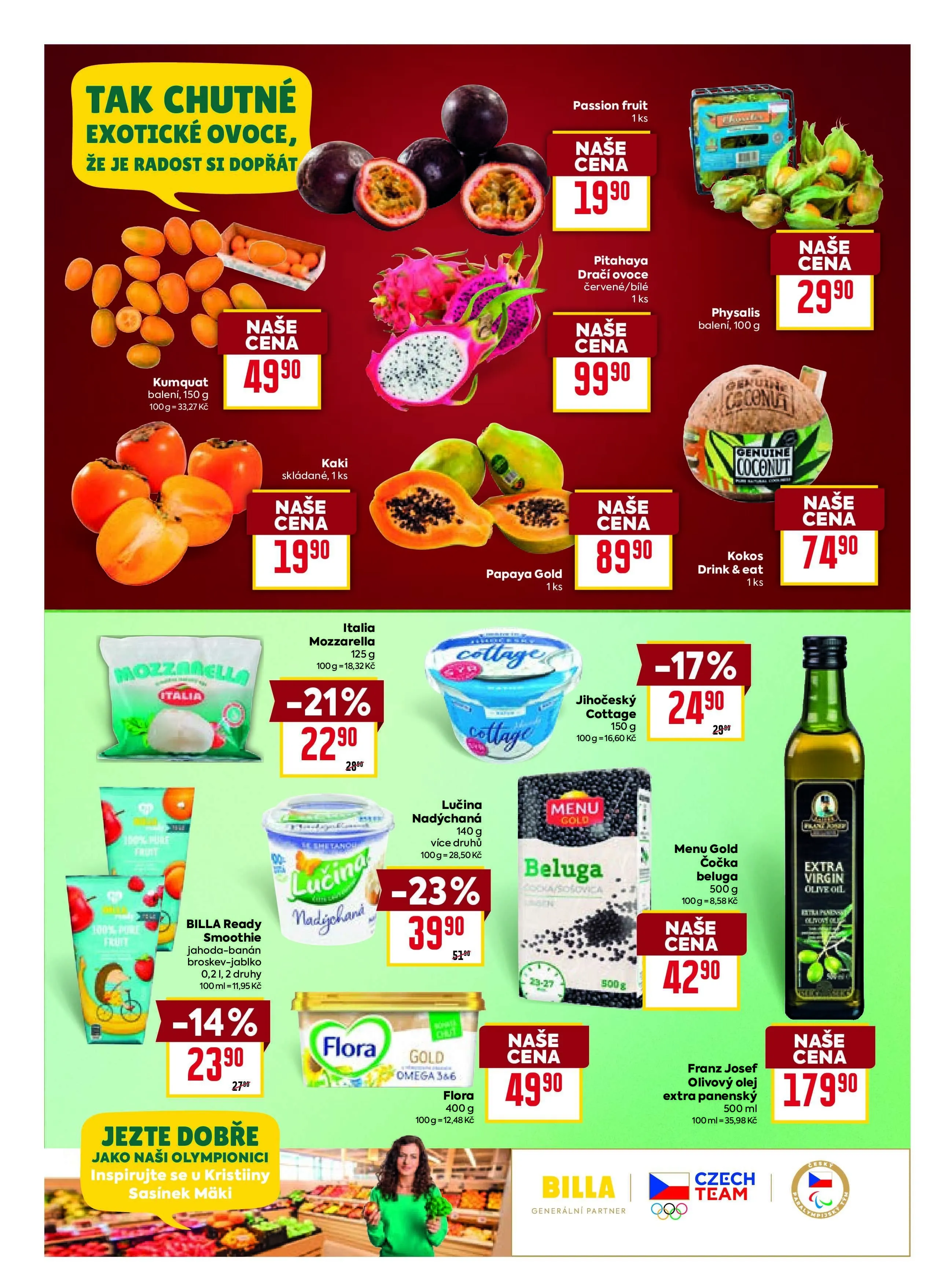 V letáku obchodu BILLA najdete širokou nabídku chutného exotického ovoce, které si můžete dopřát za skvělé ceny. Například papaya za 19,90 Kč nebo passion fruit za 29,90 Kč. Nezapomeňte také na další produkty, jako jsou zdravé nápoje a speciality pro sportovce, které jsou ideální pro všechny, kdo chtějí jíst dobře jako naši olympionici. Využijte slevy až 23 % a objevte lahodné možnosti, které vám BILLA nabízí!