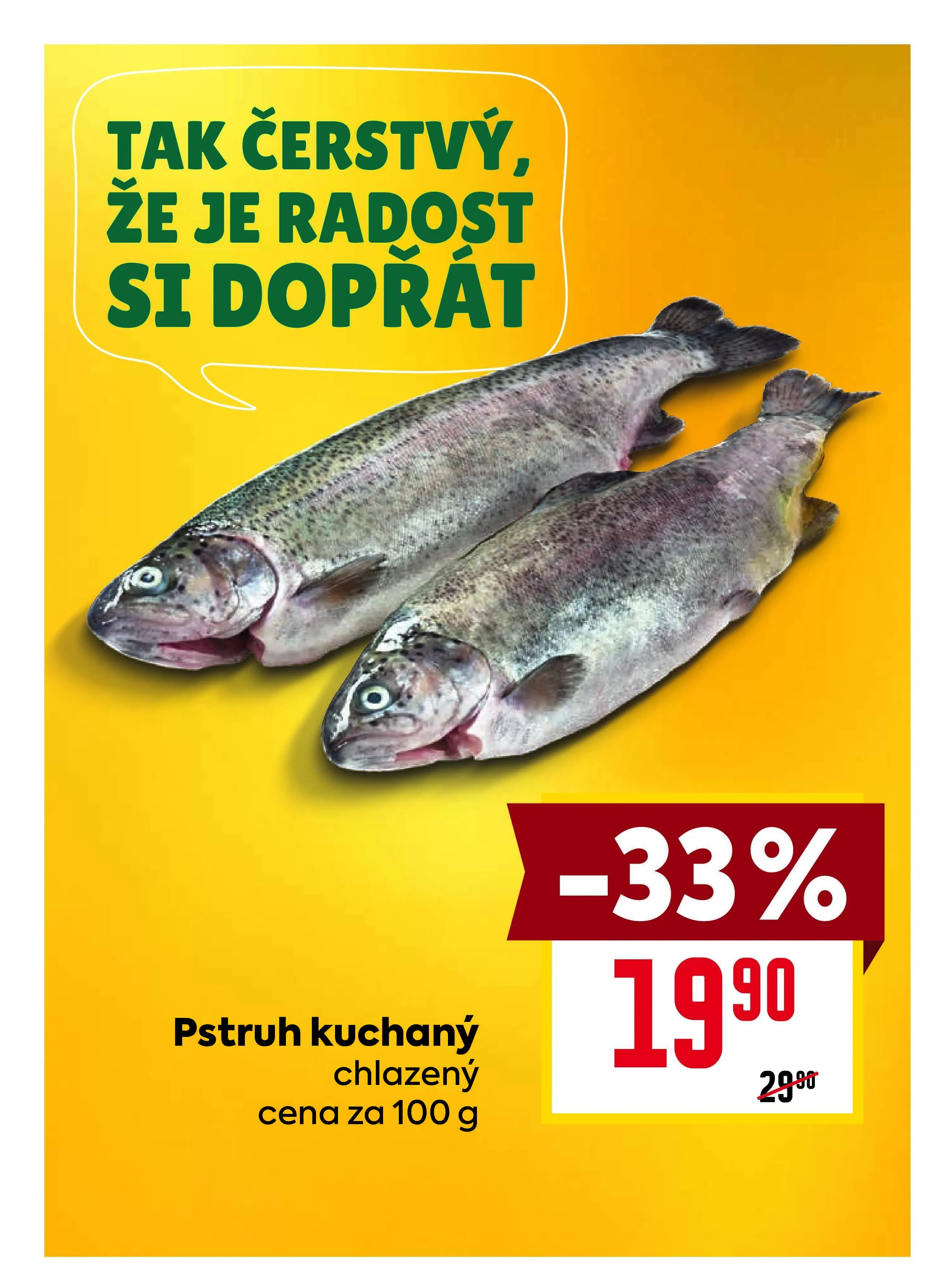 V letáku obchodu BILLA najdete skvělou nabídku na čerstvého pstruha kuchaného. Tento chlazený produkt je tak čerstvý, že si ho s radostí dopřejete. Cena za 100 g je velmi příznivá. Nezapomeňte si ho přidat do svého nákupního seznamu!