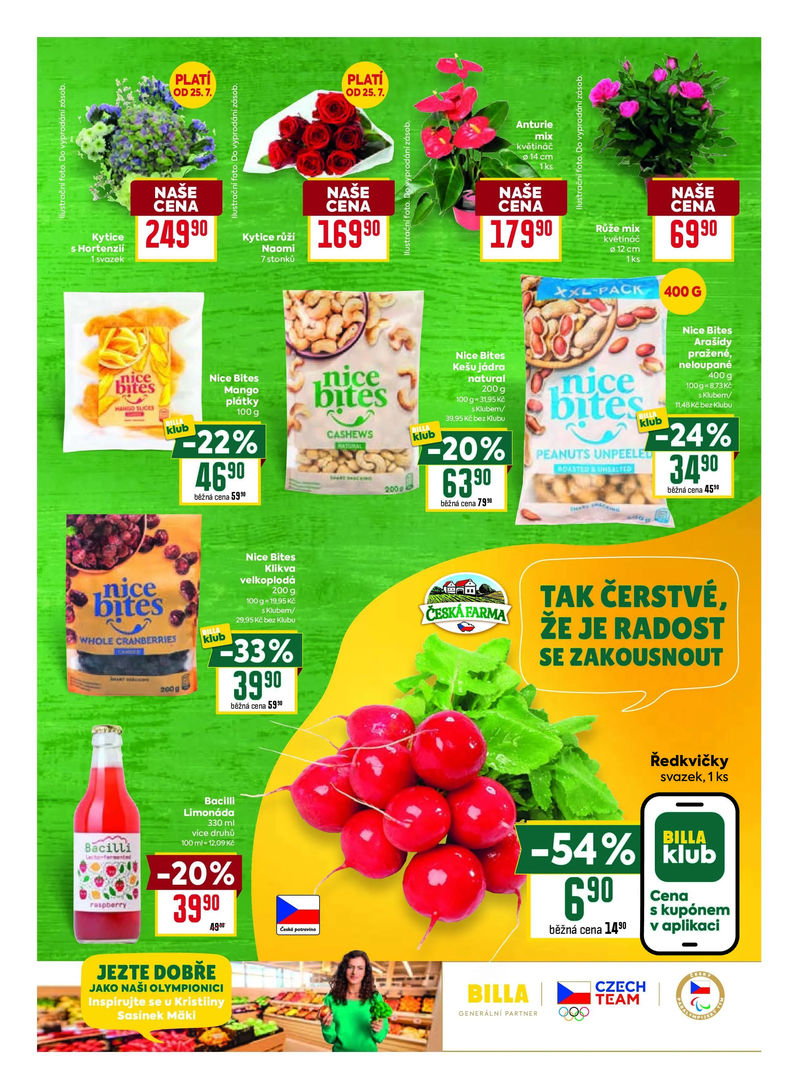 V letáku obchodu BILLA najdete širokou nabídku produktů za skvělé ceny. Například kytice "Nice Bites" je nyní za cenu 169,90 Kč. Pro milovníky zdravých snacků máme "Nice Bites" mango plátky s 22% slevou a "Nice Bites" klikva s 33% slevou. Nezapomeňte také na "Nice Bites" kešejádro 200 g za 34,90 Kč. A pro čerstvou chuť doporučujeme ředkvičky v svazku za pouhých 6,90 Kč s kupónem v aplikaci. Přijďte si vybrat a užijte si skvělé nabídky!