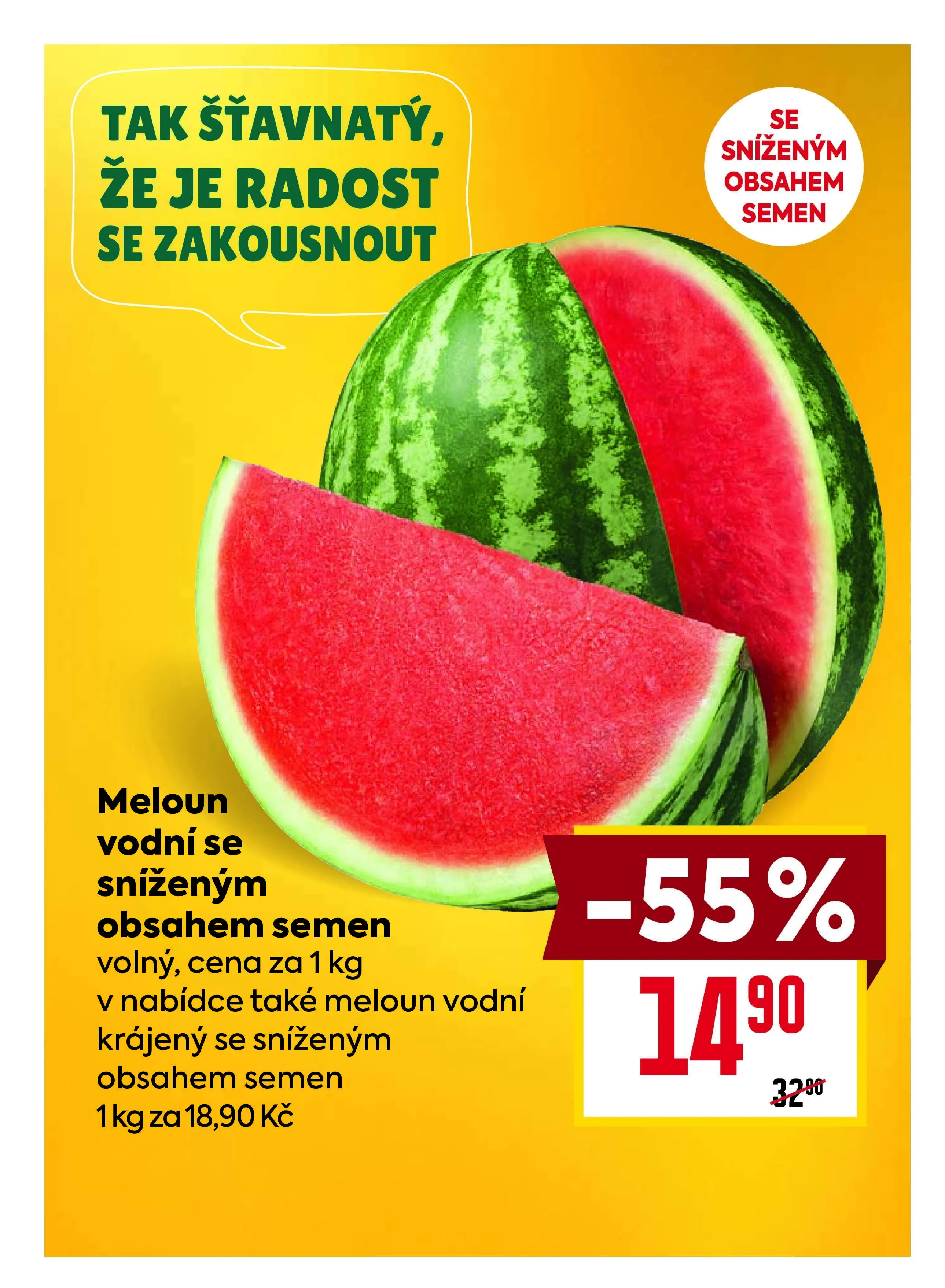 V letáku obchodu BILLA najdete šťavnatý vodní meloun se sníženým obsahem semen, který je ideální na letní osvěžení. Můžete si ho zakoupit volný za skvělou cenu 18,90 Kč za 1 kg. V nabídce je také krájený vodní meloun se sníženým obsahem semen. Nezapomeňte využít akční slevu -55%!
