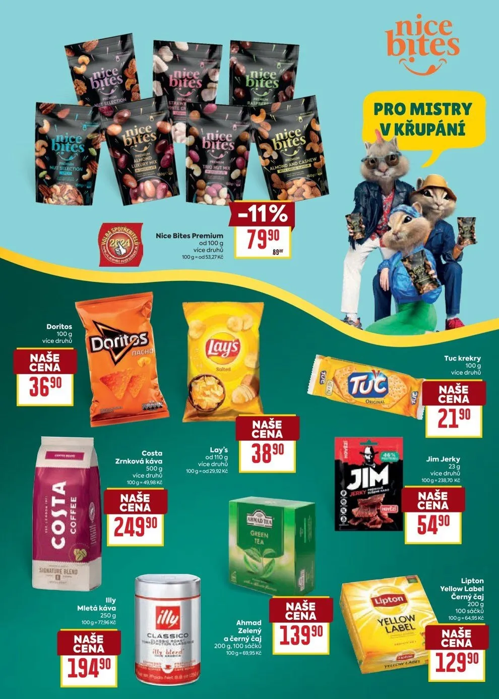 Mezi oblíbené snacky patří Nice Bites Premium, které jsou k dostání od 100 g a v různých druzích za cenu 312,70 Kč.