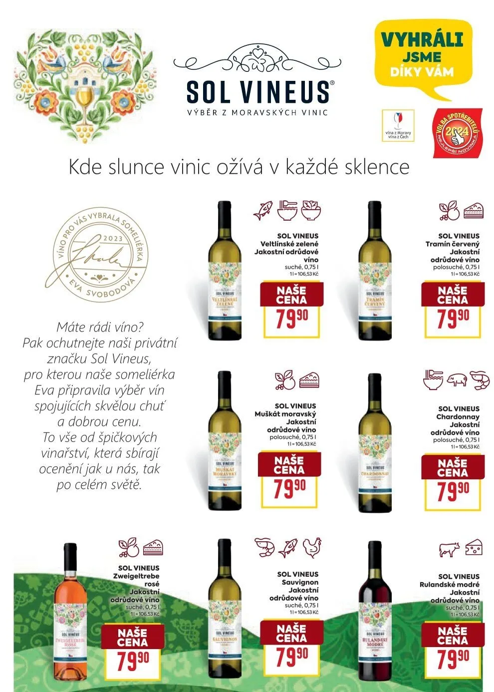 Vyhráli jsme! Objevte naši privátní značku vína Sol Vineus, která pochází z moravských vinic, kde slunce ožívá v každé sklence. Naše someliérka Eva pro vás připravila výběr vín, která spojují skvělou chuť a dobrou cenu. Všechna vína pocházejí od špičkových vinařství, která sbírají ocenění jak u nás, tak po celém světě.