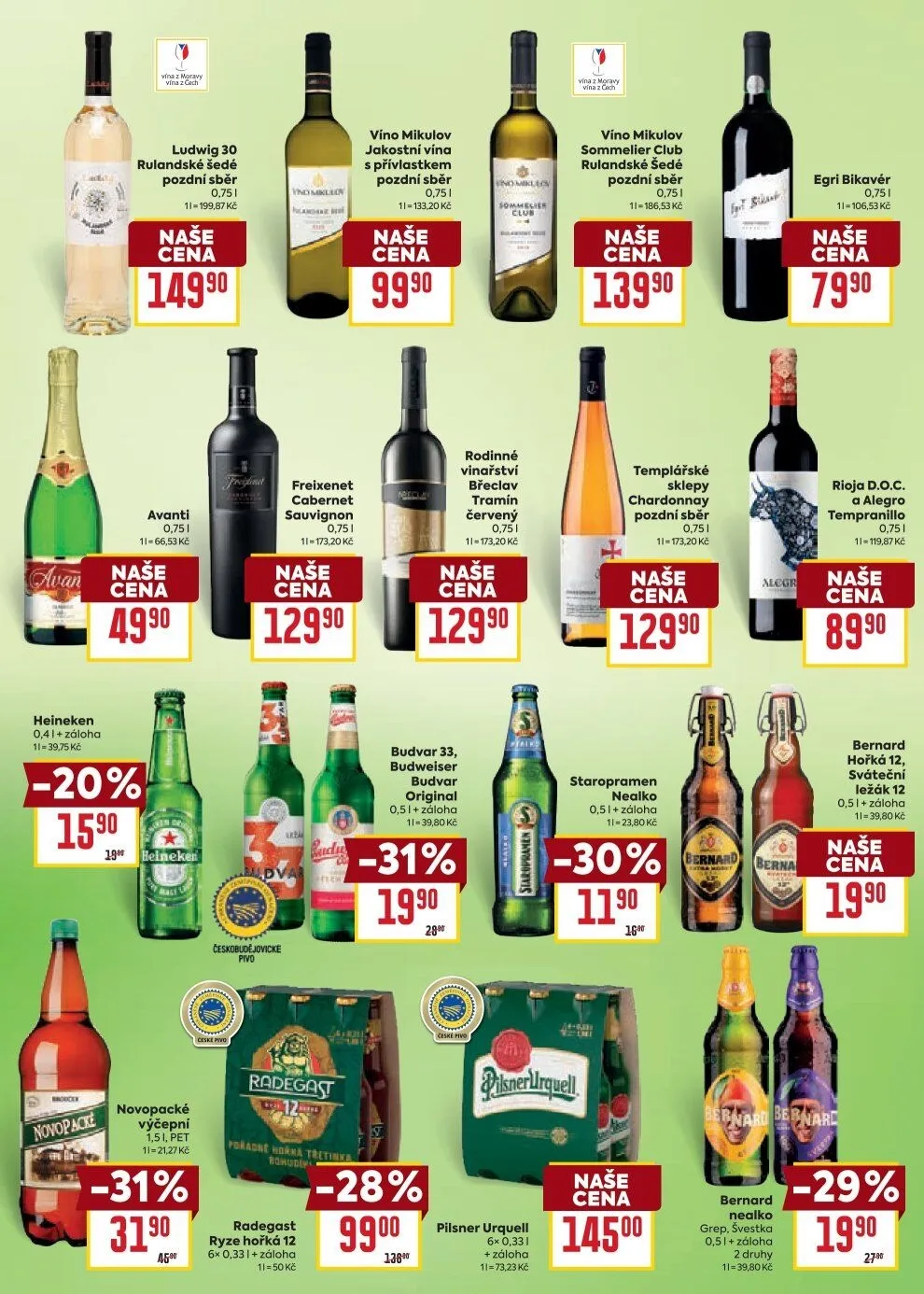 Milovníci piva si mohou vybrat z nabídky Heineken s 20% slevou za 15,90 Kč nebo Budweiser Budvar s 31% slevou za 19,90 Kč. Nezapomněli jsme ani na nealkoholické varianty, jako je Bernard nealko grep a švestka, které jsou k dispozici za 19,90 Kč.