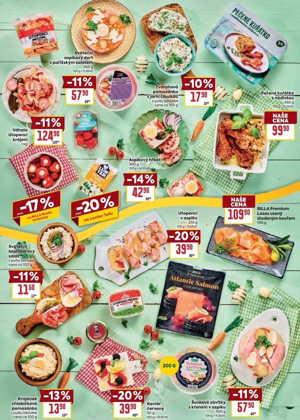 V letáku obchodu BILLA najdete širokou nabídku lahůdek a delikates. Mezi nimi se objevuje aspikový dort s pařížským salátem, který váží 500 g a je nyní se slevou 11 %. Dále si můžete pochutnat na utopencích krájených v aspiku, které jsou k dostání v balení 255 g se slevou 20 %.