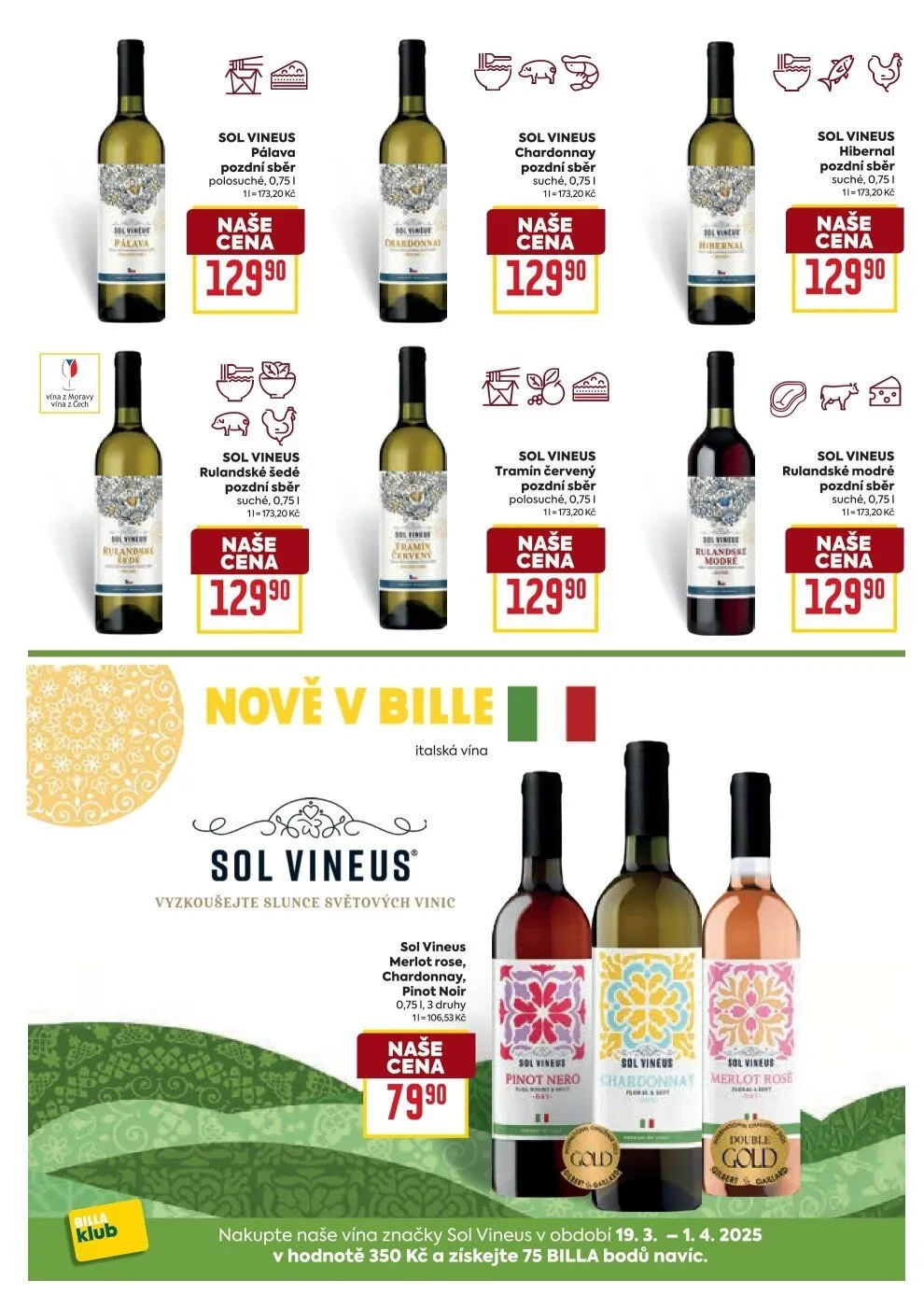 Navíc, pokud nakoupíte vína značky Sol Vineus v období od 19. března do 1. dubna 2025 v hodnotě 350 Kč, získáte 75 BILLA bodů navíc. Nezapomeňte vyzkoušet slunce světových vinic!