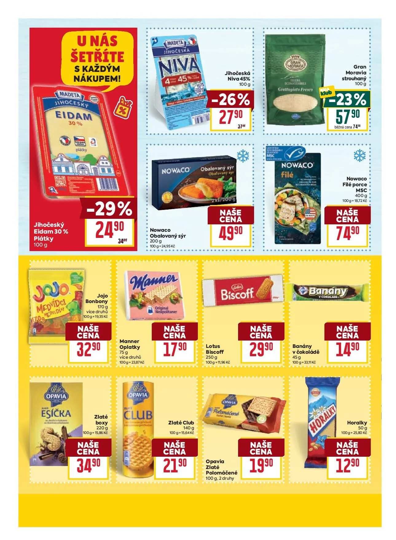 Dalšími lákadly jsou Zlaté polomáčené Opavia (100 g) a strouhaný sýr Gran Moravia (100 g) za 21,90 Kč.