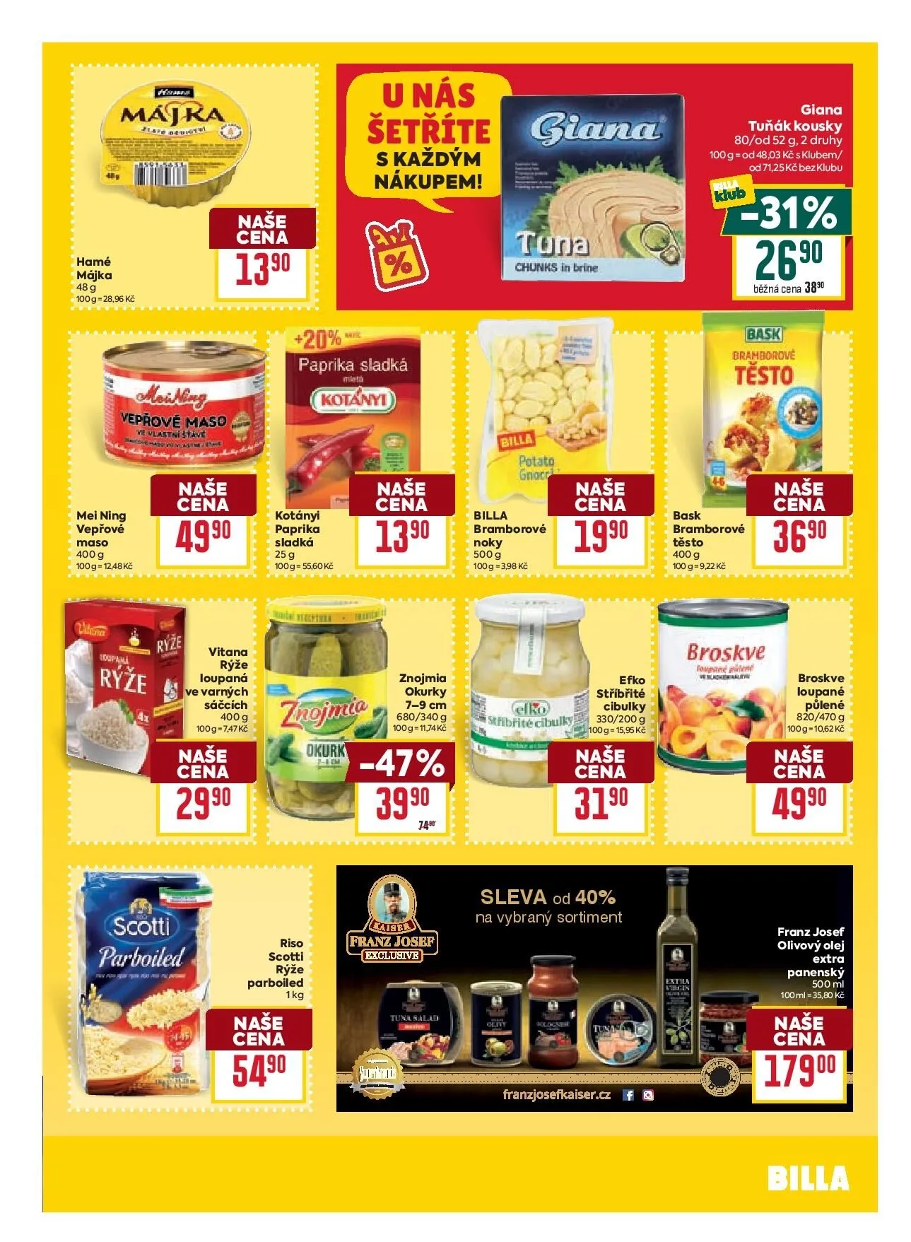 V letáku obchodu BILLA najdete širokou nabídku kvalitních produktů za skvělé ceny. Například bramborové noky značky Gnorr o hmotnosti 500 g za 39,90 Kč, nebo tuňáka kousky od značky Giana, který je k dostání v různých variantách.
