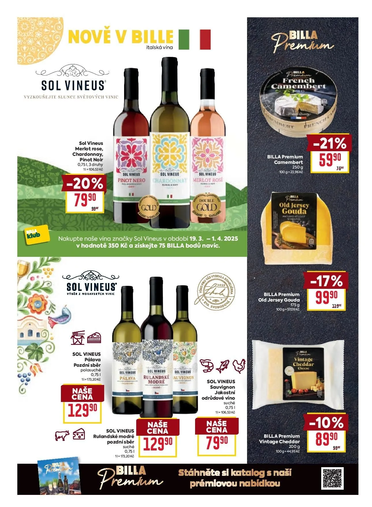 V letáku obchodu BILLA najdete širokou nabídku kvalitních vín značky Sol Vineus. Vyzkoušejte slunce světových vinic s našimi odrůdami jako Merlot Rosé, Chardonnay a Pinot Noir, které jsou nyní se slevou 20%. Při nákupu vín v hodnotě 350 Kč v období od 19.3. do 1.4.2025 získáte navíc 75 BILLA bodů.