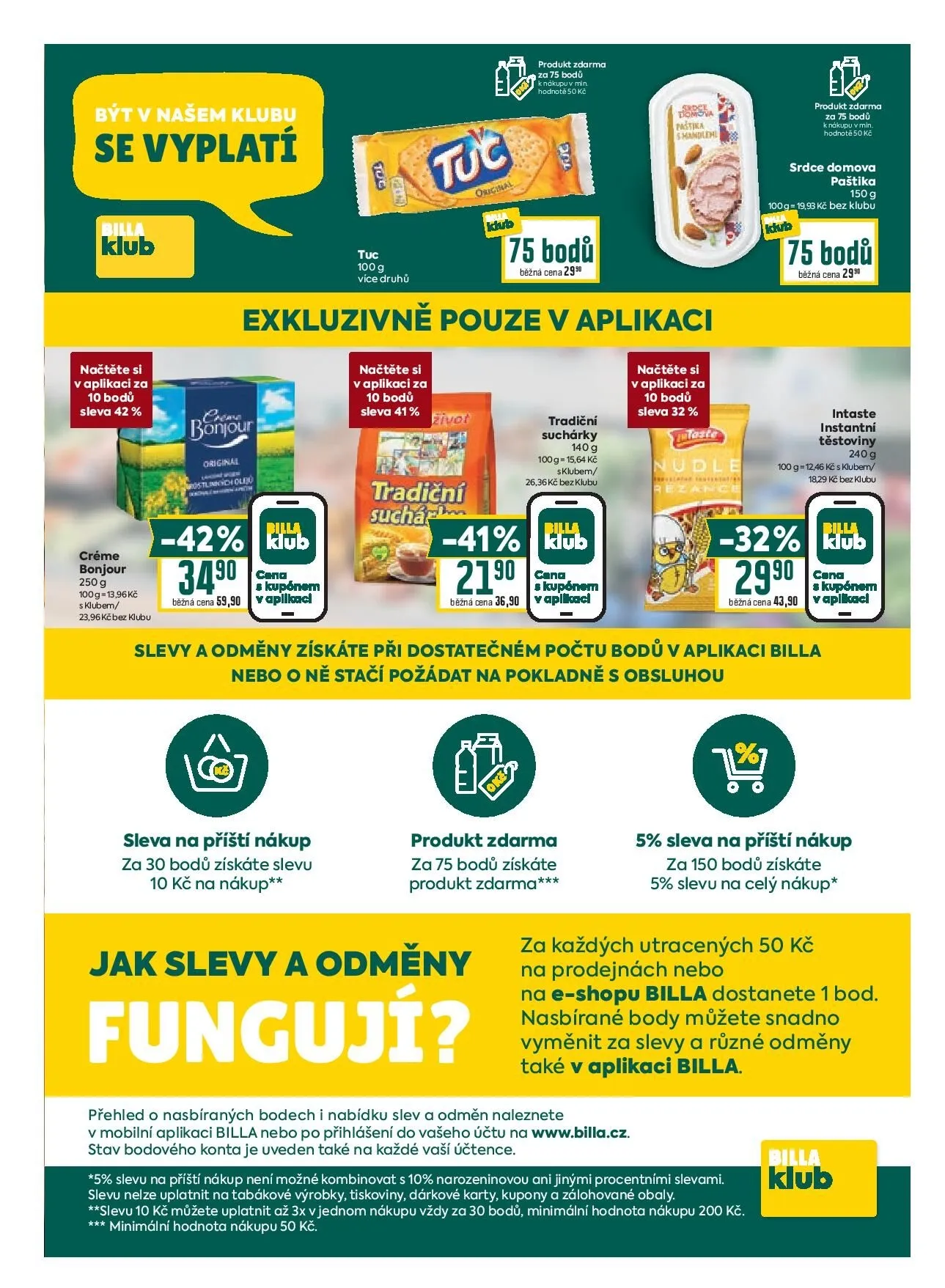 V letáku obchodu BILLA najdete širokou nabídku produktů, které se vyplatí mít v košíku. Například tradiční suchárky o hmotnosti 140 g jsou nyní se slevou 42 % a můžete je mít za skvělou cenu. Dále nabízíme paštiku "Srdce domova" o hmotnosti 150 g, která je také za výhodnou cenu.