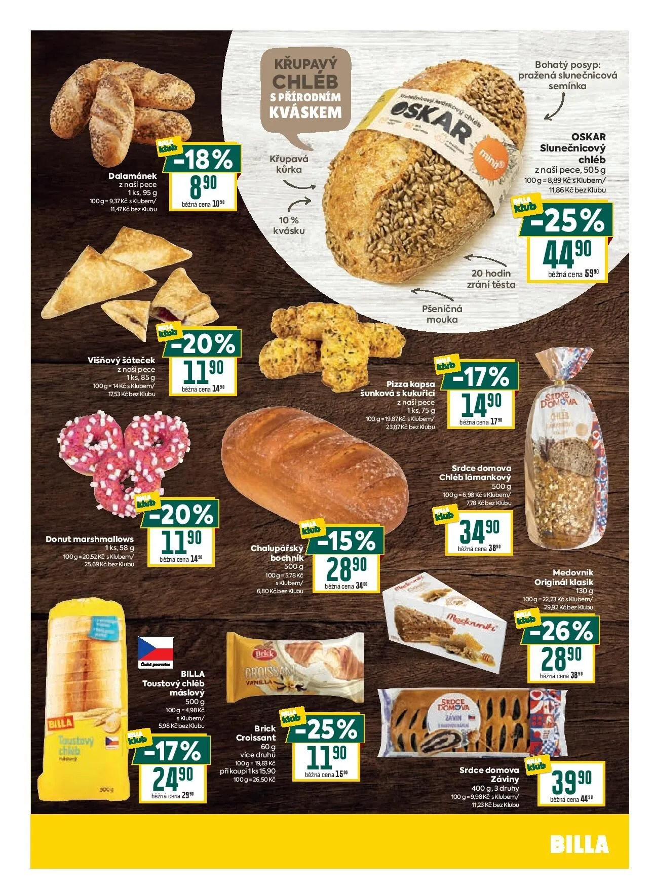 V letáku obchodu BILLA najdete širokou nabídku čerstvých pekárenských výrobků. Mezi nimi vyniká křupavý chléb s přírodním kváskem, který má bohatý posyp z pražených slunečnicových semínek. Dále si můžete pochutnat na višňovém šátečku nebo pizza kapsách, které jsou ideální na rychlé občerstvení.