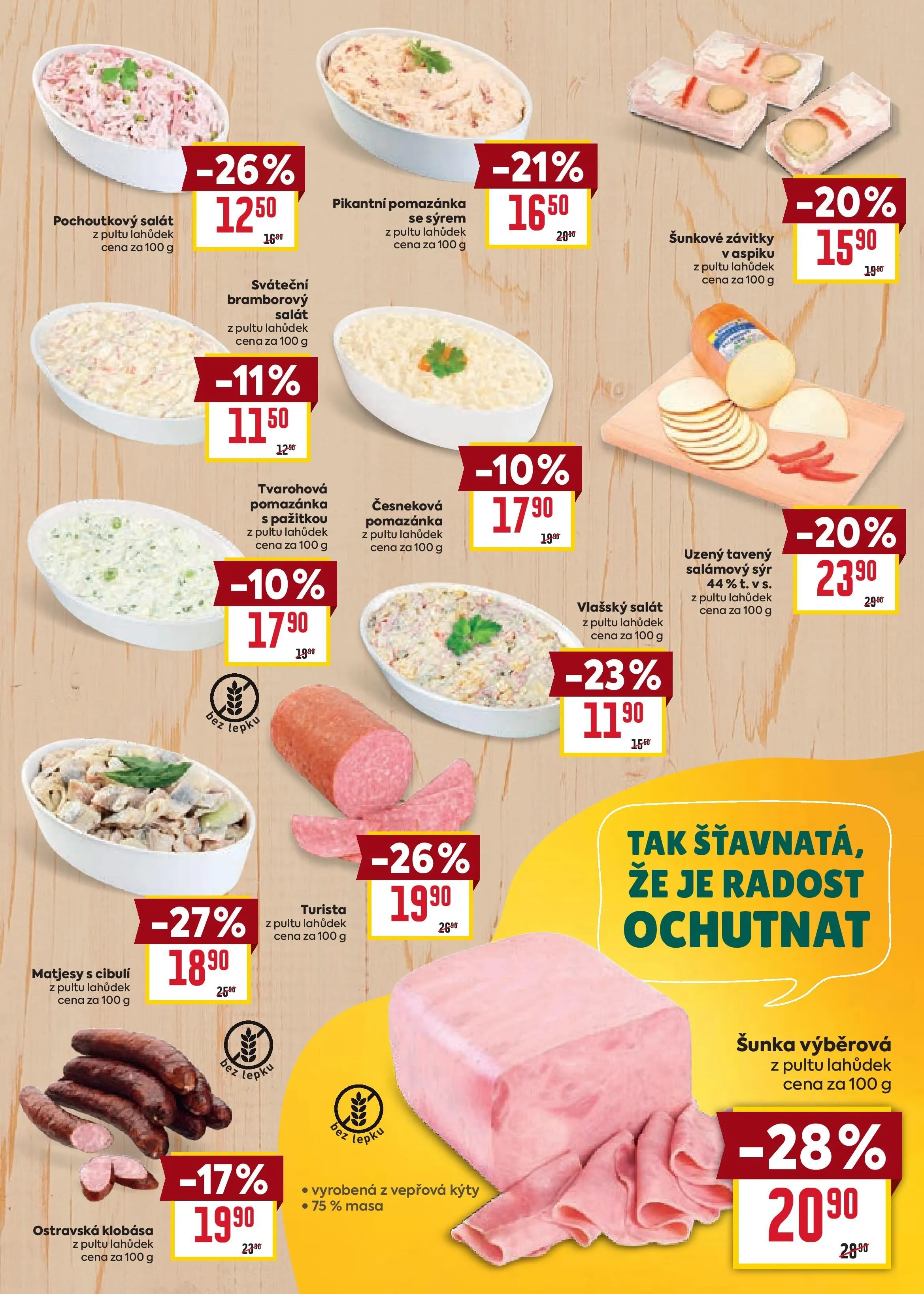 Mezi oblíbené produkty patří pochoutkový salát, sváteční bramborový salát a tvarohová pomazánka s pažitkou, všechny z pultu lahůdek.