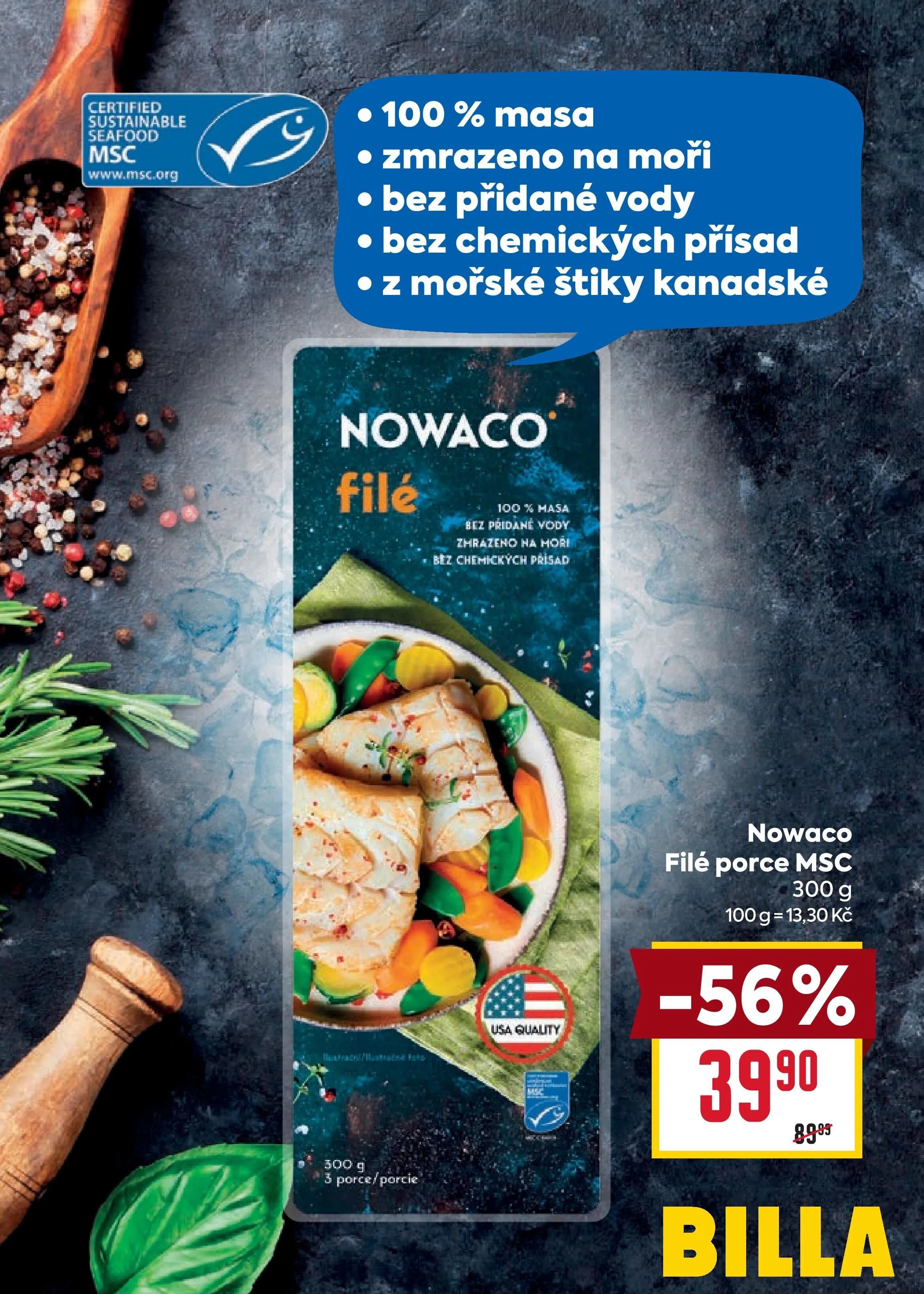 V letáku obchodu BILLA najdete širokou nabídku certifikovaných a udržitelných mořských plodů. Mezi nimi vyniká filé z mořské štiky kanadské značky Nowaco. Toto filé je 100 % maso, zmrazené přímo na moři, bez přidané vody a chemických přísad. Nabízíme ho v porci 300 g za skvělou cenu 13,30 Kč. Nezapomeňte si ho přidat do svého nákupního seznamu!