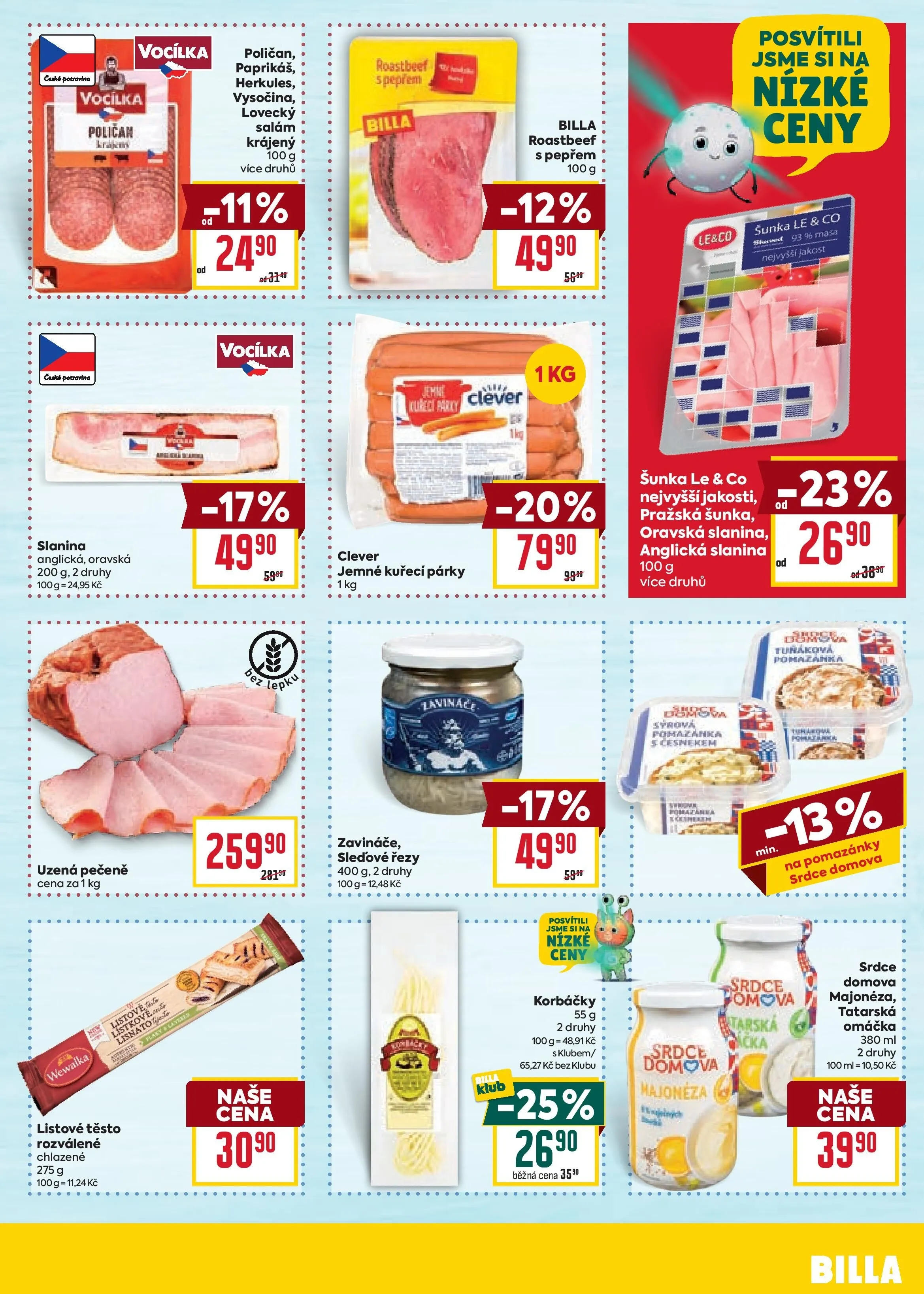 V letáku obchodu BILLA najdete širokou nabídku kvalitních masných výrobků. Mezi nimi se objevují anglická a oravská slanina, které jsou k dostání v balení po 200 g za cenu 24,95 Kč za 100 g. Dále si můžete vybrat z různých druhů salámů, jako je poličan, paprikas, herkules, vysočina nebo lovecký salám, které jsou krájené a dostupné za 35,90 Kč za 100 g.