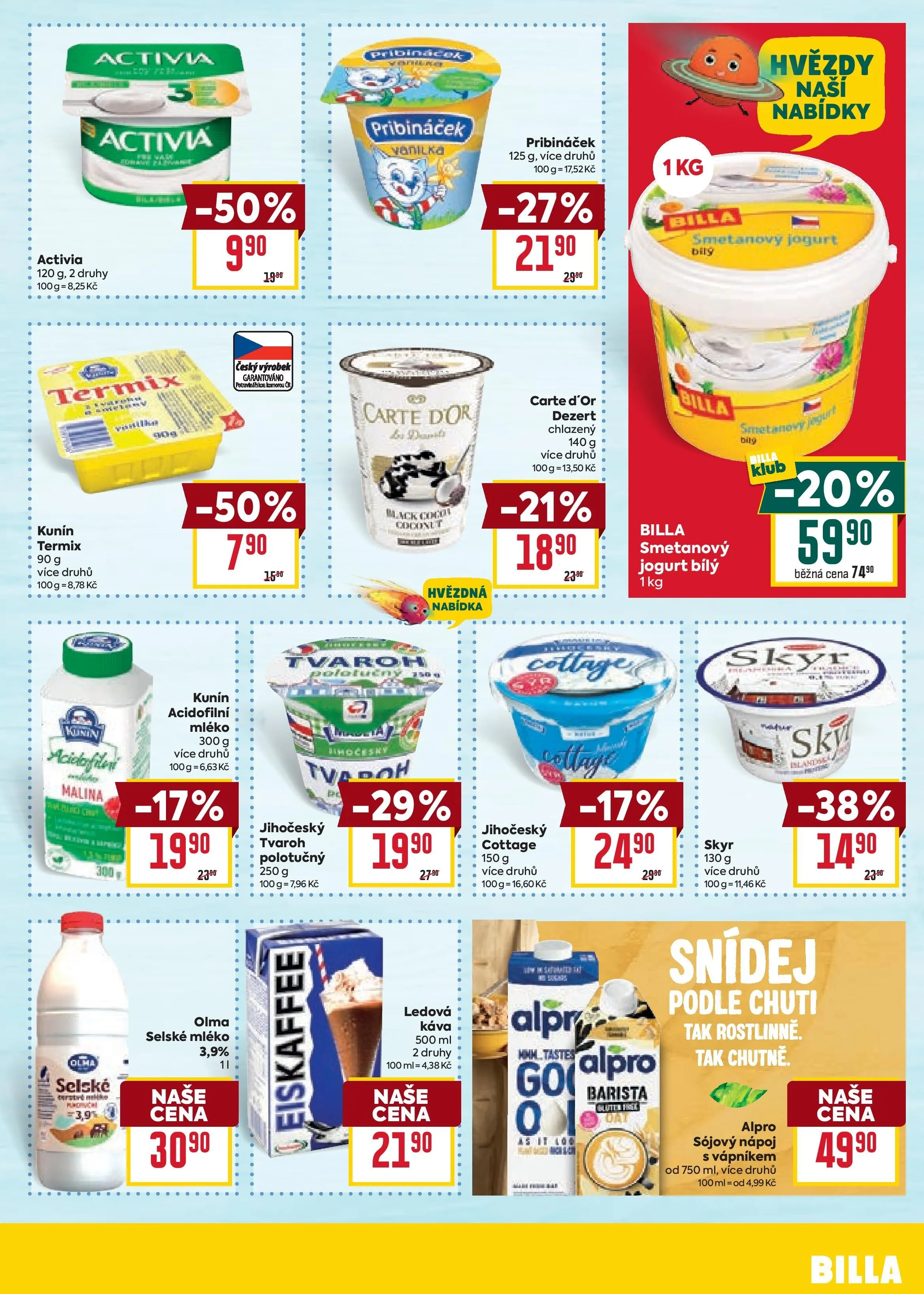 V letáku obchodu BILLA najdete skvělé akční nabídky na různé produkty. Například jogurty Activia a český výmbek jsou nyní se slevou 50%. Activia je k dispozici v 120 g balení a český výmbek v 90 g variantě. Dále si můžete vybrat z acidofilního mléka Kunín nebo selské mléko Olma, které má 3,9% tuku.