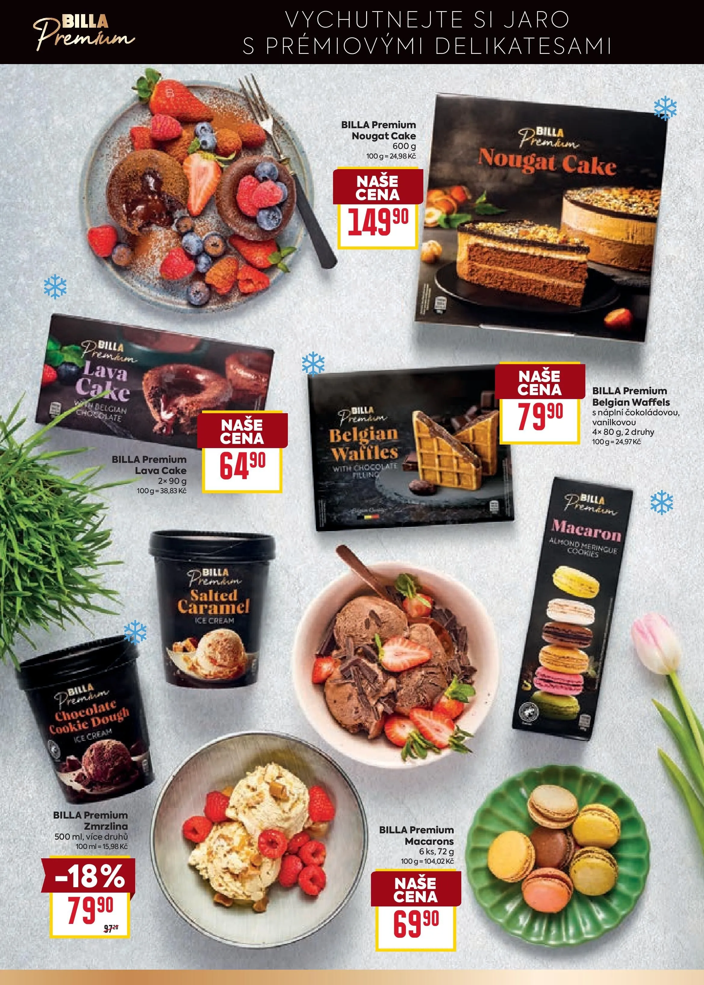V letáku obchodu BILLA najdete skvělou nabídku prémiových produktů, které si můžete vychutnat na jaře. Mezi nimi je BILLA Premium Nougat Cake o hmotnosti 600 g za cenu 149,90 Kč. Dále si můžete dopřát delikátní BILLA Premium Lava Cake (290 g) za 79,90 Kč. Nezapomeňte také na BILLA Premium Macarons (6 ks, 72 g) a BILLA Premium Belgian Waffles s čokoládovou náplní (4 ks, 80 g), které jsou skvělou volbou pro sladké chvíle. Všechny tyto produkty jsou ideální pro oslavy nebo jako sladká tečka po jídle.